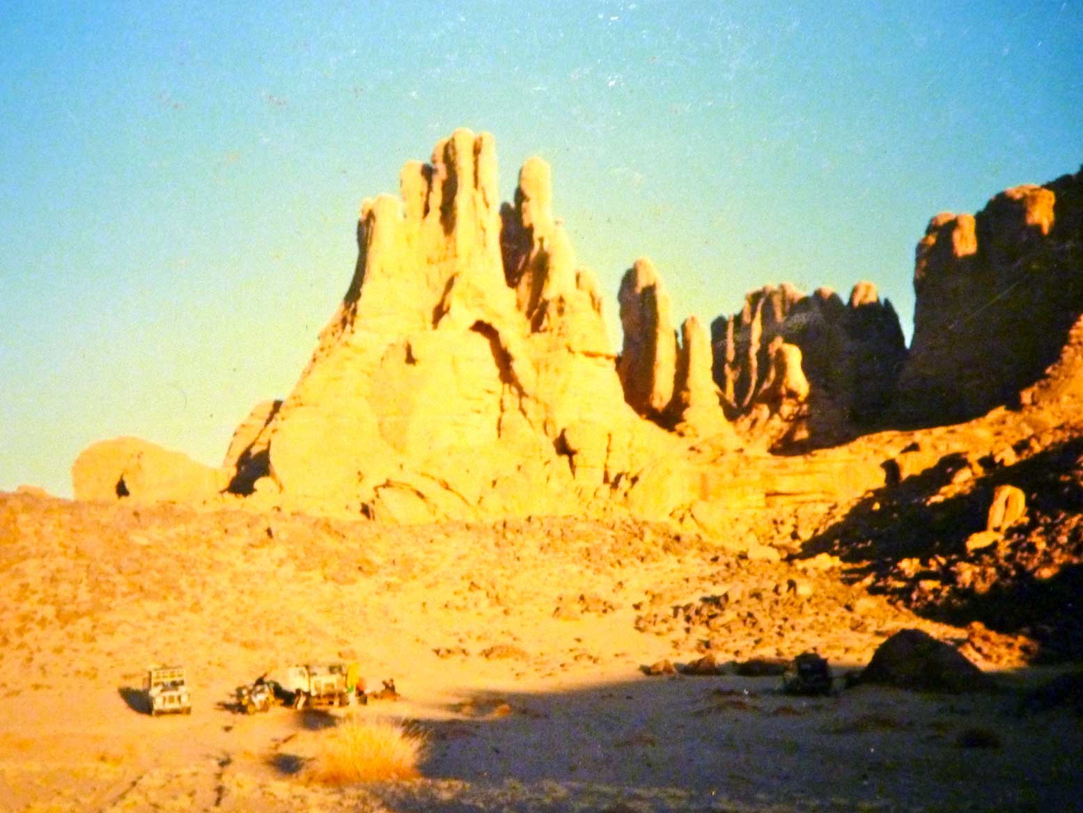 This was before GPS and at the time I was too preoccupied keeping track of the bikes and my Landrover’s numerous issues to attempt to follow our progress on a map with dead reckoning. Our guide, Chadli, knew his stuff but was rather reticent – they teach them that in guide school. I knew the vague location within 50 square miles – the photo credit in the book says ‘near Tin Tarabine’ which is true enough, but that area, if not the whole Tassili-Hoggar southeast of Tam, is famed for unusual rock formations.
