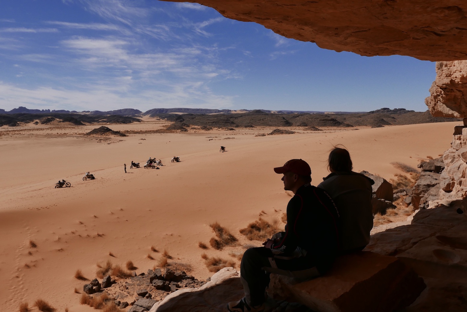 If you could get to Fort Polignac (Illizi), a car route did actually cross the Fadnoun. You left Polignac to the east then either pitted yourself against the very sandy Imirhou gorge (left) , or all the way to Tarat fort on the Libyan border, before turning south to join today’s route at Dider. On bikes for Desert Riders in 2003 (the full movie is on YouTube), this was a tough but epic ride across the tumbled escarpments of the Tassili which took us two hard days. But the time we reached the final descent from the plateau at the Tin Taradjeli Pass, we couldn’t wait for the sands of the wide open Tenere.