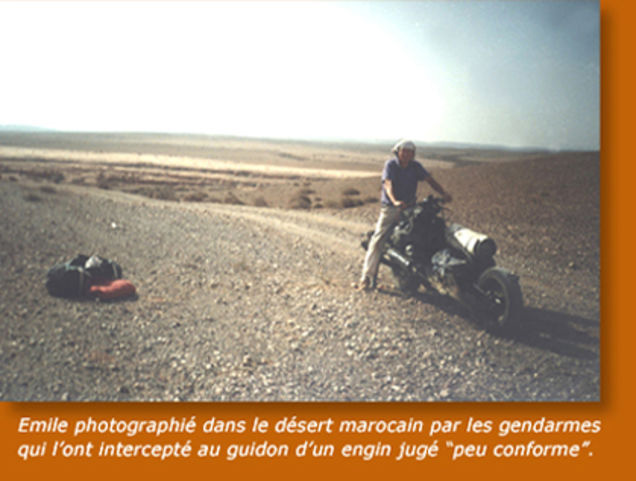 He leaves the next afternoon leaving the parts that he will not use in the body shell of the 2CV. He takes with him the rest of his food (more than a litre and a half of water), the bed, the tool box, not forgetting maps and compass. A small foam mattress and a towel sewn together will serve as a tent. After a bumpy ride and a few stops for mechanical improvements, he encamped and slept at the edge of a track. In the night, he is awakened by three soldiers in 4×4, one of which immediately recognizes the “tourist” of Tilemsem. Very irritated to find him in the forbidden zone, he strongly doubts Emile Leray’s explanations; an accident followed by the transformation into a motorcycle. Intrigued by the machine, but totally incredulous, the soldier demands to see the carcass of the 2CV to have proof of this incredible story. The officer puts an armed guard by the tent and the motorcycle, then embarks with Émile in the 4×4. After an hour of research in the dark, the remains of the 2 CV cannot be found. Back at the camp, Émile is allowed to rest near the motorcycle until dawn, guarded a hundred meters away by the military in their 4×4. The next day, the carcass was found and the soldiers relax. Émile will learn later that his interlocutor wanted to recover the abandoned pieces for his brother-in-law …