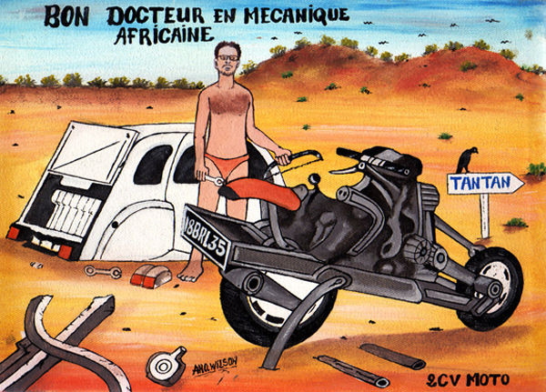 The next day Emile is summoned to sign the forms to exit the territory, and leave for France. He thinks he should come back as soon as possible to get the bike back, but by then he must find a place to park it. There is no question that he leaves her in the pound, it may cost him dearly, and the place is not guarded. A customs officer who is more sympathetic than his colleagues offers to take the steel camel home while waiting for him to return to Morocco. A month later Emile made the 3500-km journey between Rennes and Tan-Tan with another 2CV to pick up his motorcycle, now dismantled in three parts … Since then, the steel-motorcycle camel has enjoyed the honors of the press and participated in a few events such as the Aventure and the Inventors of Rennes, the fiftieth anniversary of the 2 CV in Saint-Quentin-en-Yvelines, Without forgetting the Motards have heart. Émile returned several times to Africa, and in 2006 took a new opportunity for the Doctor of African mechanics to exercise his transformational talents on the steel camel [below]…