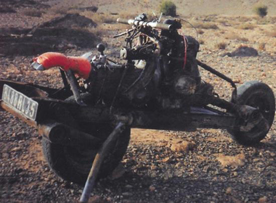 Just west of Tilemsen, Leray ‘had an idea’. He decided to circumvent the checkpoint to the north (see MW1 KM22), and rejoin MW2 eastwards. But once on the piste (or ‘off-piste’, as claimed) one of the 2CV’s suspension arms broke after hitting a hole too hard. With ten days’ provisions on board but reluctant to easily walk-out and leave his car vulnerable to theft, he decided to strip his crippled Citroen and rebuild it into a rudimentary motorcycle, then ride out as if nothing much happened. The unusual powertrain and suspension arrangement of a 2CV makes such a conversion plausible.