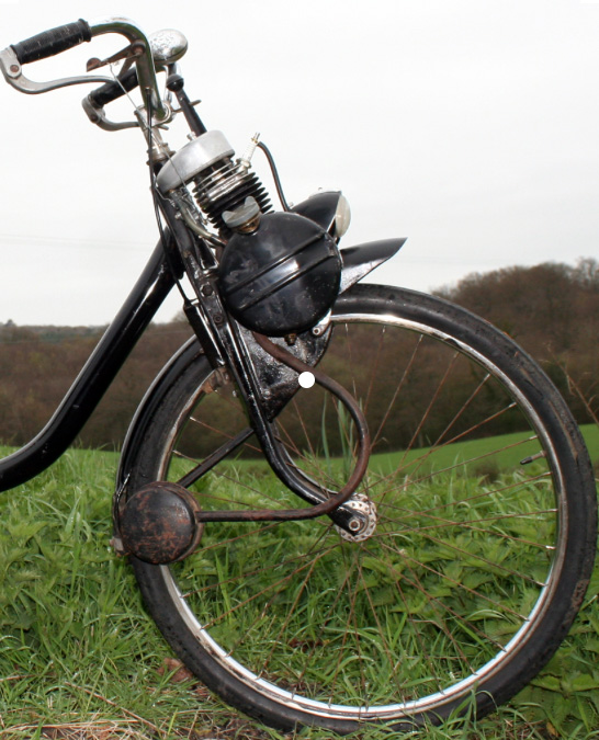 The most surprising thing about this 2CV motorcycle is the transmission. It was inspired by the Vélosolex moped idea (right): the engine drives a drum which in turn turns the tyre by friction, and which, by the laws of physics and mechanics, obliges it to roll with the reverse. Disassembling the gearbox to reverse the differential would have been too risky in this universe of sand …