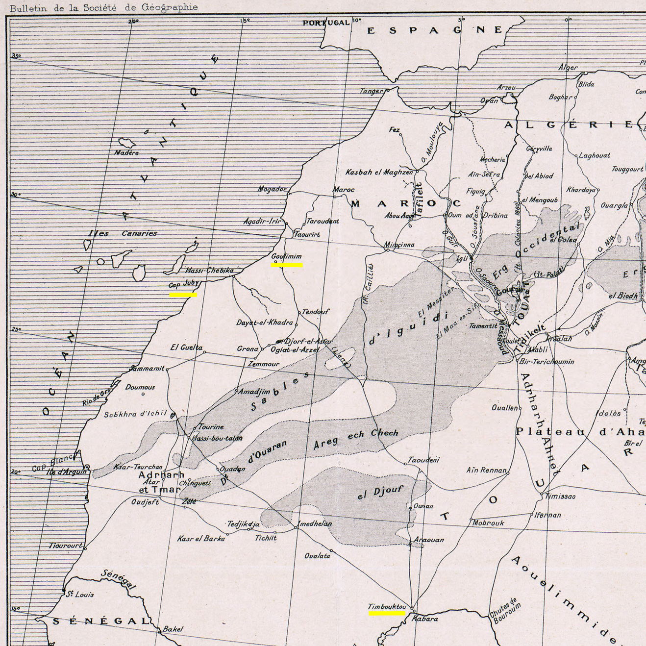 Mackenzie diligently read up on all your great 19th-century Saharan explorers: Barth, Rohlfs, Caille, Duveyrier, Clapperton, and in 1877 published an exhaustive proposal [available online] to ‘The Presidents and Members of the Chambers of Commerce of Great Britain‘ stressing ‘the importance of holding commercial intercourse with the interior‘. Vividly detailing at third hand the riches, economy, geography and ethnicities in this corner of Africa, he firmly believed his northern route reaching down into the African interior was the key, avoiding the disease-ridden equatorial jungles and pagan tribes further south in favour of the more sophisticated vestiges of the West African Islamic states. Under his proposal, land distances for the annual camel caravans from Timbuktu would be halved, with Cape Juby just nine sea days from Britain. De Lesseps himself, the force behind the Suez and original Panama canals, supported the idea of Saharan flooding, believing a side benefit would somehow improve the European climate while greening the desert for agriculture.