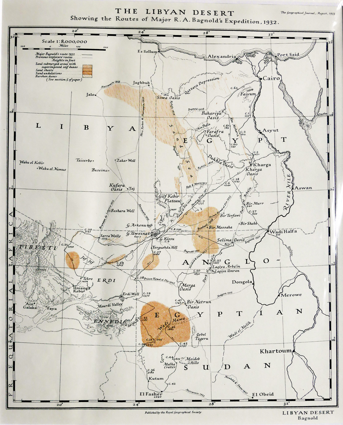 A year later they set off towards Jebel Uweinat, a massif located by Ahmed Hassanein less than a decade earlier during a camel trek along Libya’s eastern borders. At Ain Dalla camels brought in extra fuel, and the cars continued to Jebel Kissu in today’s Sudan and south of Uweinat, then east for the Nile via Selima oasis.