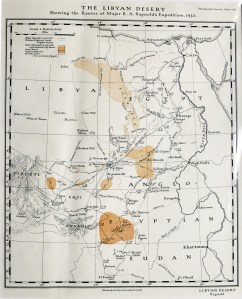 The maps on the left and below show the routes of all these trips and Bagnold’s book, Libyan Sands (right) covering all these expeditions and more and is well worth reading. Reviewed here. Short bio of Ralph Bagnold.