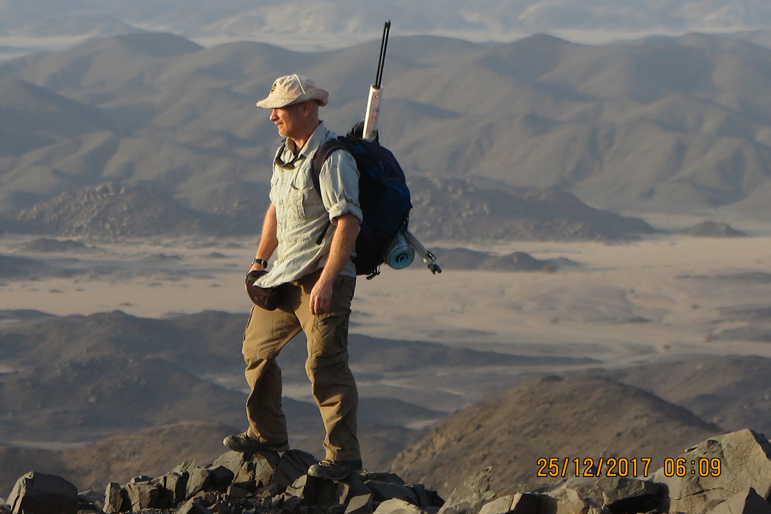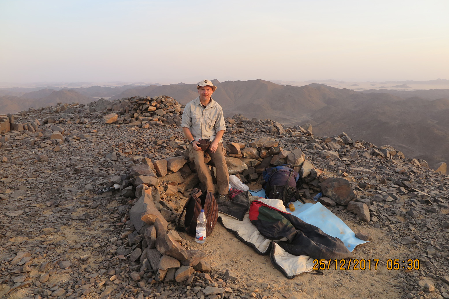 Once over the border we headed towards the eastern end of the territory and Jebel Hagar el Zarqa. On the 1925 map it was shown as the highest point in the land at just 705m (2313’), but one man’s hill is another man’s mountain. It lay some 30 miles away and we headed straight for it; in reality zigzagging through a maze of sandy wadis. Just five miles away our target came in sight and, as I’ve said before on my travels in Africa, once I was so close it would take an army of natives riding a herd of wild elephants and throwing landmines to stop me. Given that we saw no one during our time in Bir Tawil, I felt confident. We weaved our way nearer and nearer and by mid-afternoon on Christmas Eve parked up at the base of the mountain. My aim was to sleep on summit but Moez my guide warned it might be chilly. It may the mid-winter but this is still the Sahara so I replied I’d probably survive but suggested he took his big down jacket. Around 4pm, as the sun’s heat diminished we set off, following the edge of a gully until we met a ridge about half way up. Here it was mostly scree but in less than an hour we were on the summit. With a new African peak ticked off, Moez and I shook hands. Low hills surrounded us and Egypt’s actual border was just eight miles to the north. There was a cairn here so I was not the first, but probably the first in a very long time. Moez suggested we drop down a little out of the wind but he knew what my answer would be: we would build a windbreak right on the summit. We set about clearing an area for our wall and once done, even Moez seemed reassured. The wind did pick up later but our wall did its job.