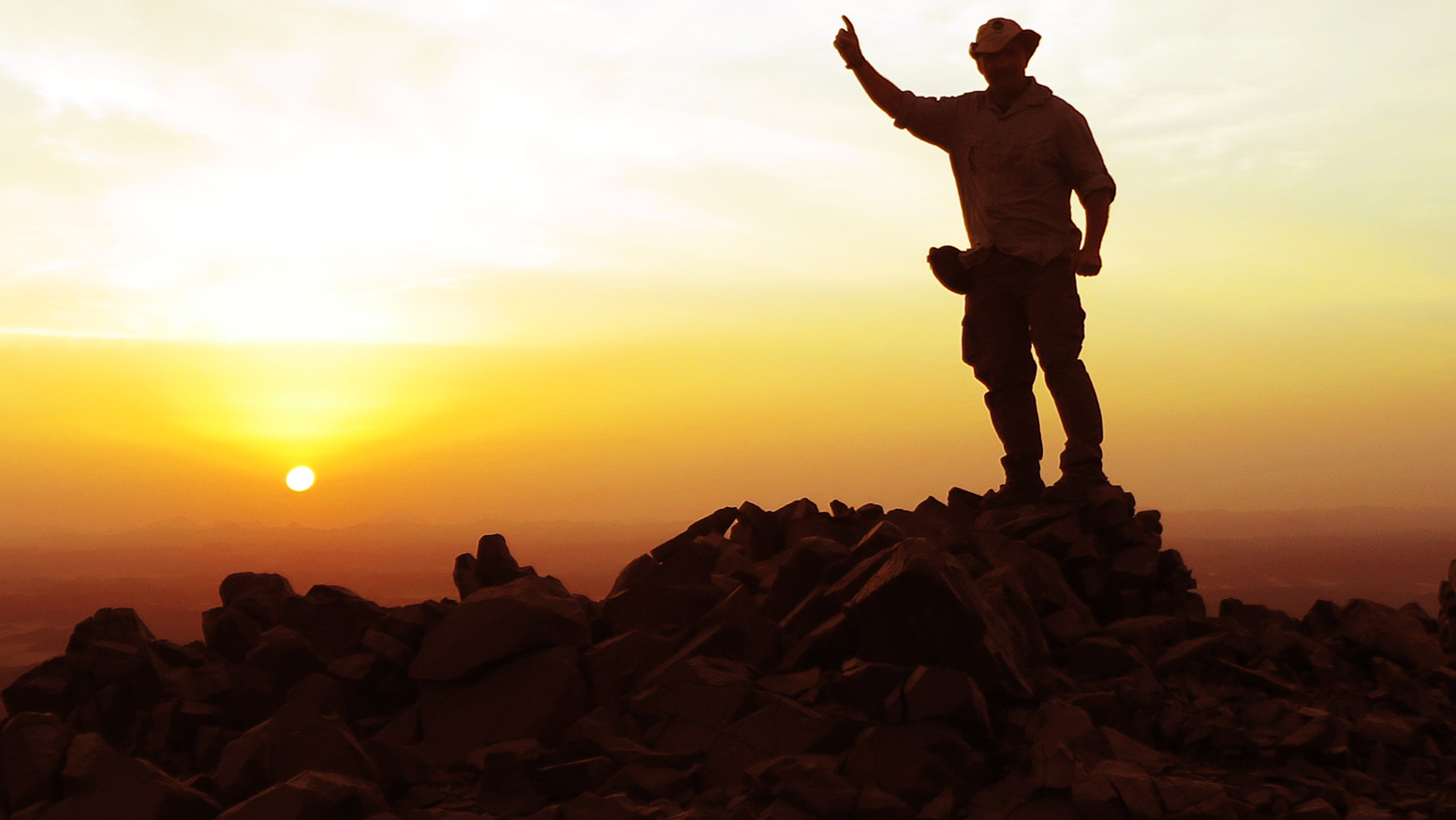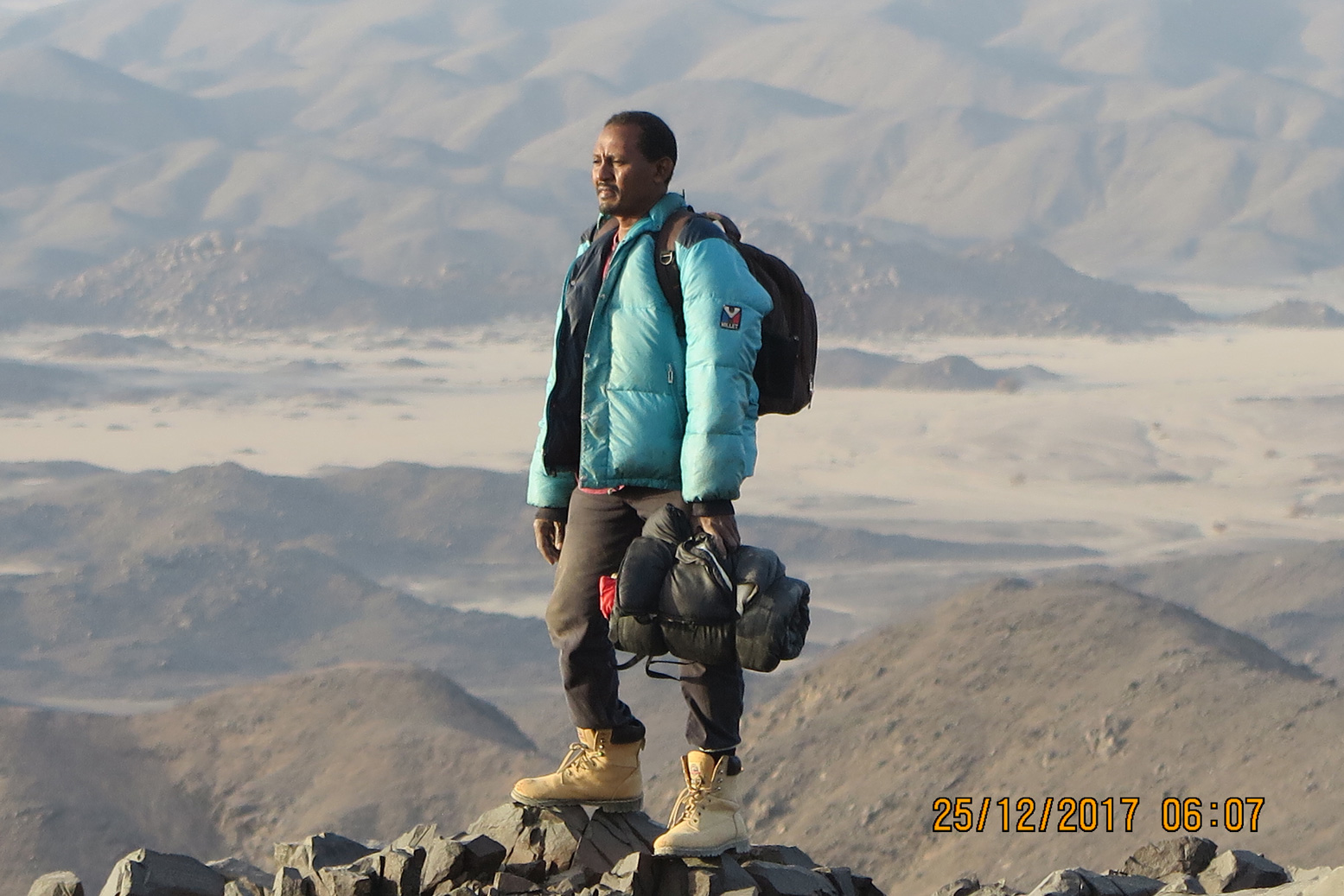 The plan was a week’s trip leaving me two days in Bir Tawil to locate and climb the highest point. Midhat’s brother Moez would accompany me with two drivers on the 500-mile trek north of Khartoum, around half of it on tarmac the rest across the Nubian desert. Forget snakes and scorpions or the possibility of breakdown and never being found, the road to Abu Hamed felt like the most dangerous part of this little adventure. Terrible driving and being forced off the road by unlit vehicles was the nearest brush with death I’ve had in a while. In Abu Hamed we filled up with fuel and water and a few miles north of town left the road and crossed over the railway lines for the last time. I input some coordinates from Grant, my go-to person when tackling unclimbed peaks in dodgy countries. You can’t beat the thrill of heading into a remote place with little available information. We headed north along flat desert towards the Wadi Gabgaba which would bring us to within 20 miles of our objective. Very soon we started to pass gold miners and for the next hundred miles found the desert had been turned upside down. A gold rush was underway and several thousand men were working hundreds of excavators while individuals were trying their luck with metal detectors. All unlicensed and unregulated, with tons of litter blew across the desert it looked very ugly indeed. Hoping to keep a low profile, that night we camped well off the main route and away from the miners. In Khartoum I’d gotten hold of a colonial-era 1:25,000 map from the National Survey and the next morning we found ourselves on old routes marked as ‘fair going’ by surveyor W Jennings-Bramley back in 1925. By camel he might have covered 20 miles a day; we did the same distance in just an hour. Our initial destination was the 609-metre peak of Jebel Bartazuga marking the southernmost corner of the Bir Tawil quadrangle. It came into view, very prominent in the otherwise flat desert. I thought we had left the last of the gold miners but I was wrong; a camp had set up here too on the very boundary of Bir Tawil. On my return leg I climbed Jebel Bartazuga, topped with an old trig point by the British to mark the boundary when they surveyed the area. Flags have also been placed here from others who’ve recently been laying claims to the territory, but they’ve all long since blown away. Probably the first westerner here in recent times was former Guardian journalist Jack Shenker in 2011. American Jeremiah Heaton followed in 2014, claiming the area as the ‘Kingdom of North Sudan’, thus delivering on a promise to make his daughter a ‘princess’. He’s in dispute with a Russian called Dmitry Zhikharev who made similar claims, and in 2017 Indian adventurer Suyash Dixit planted a tree and put up yet another flag. There are other claimants including the ‘Kingdom of the State of Bir Tawil’ with its own national anthem and the ‘Empire of Bir Tawil’. I wasn’t interested in such claims but was of course intent on climbing Bir Tawil’s highest peak which I believed had yet to be done.