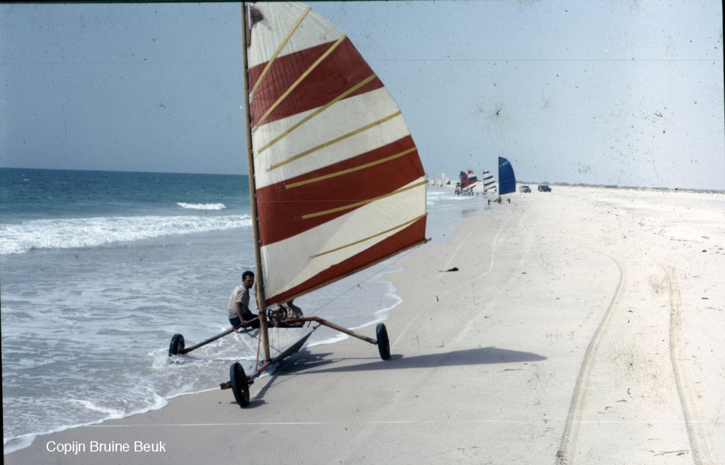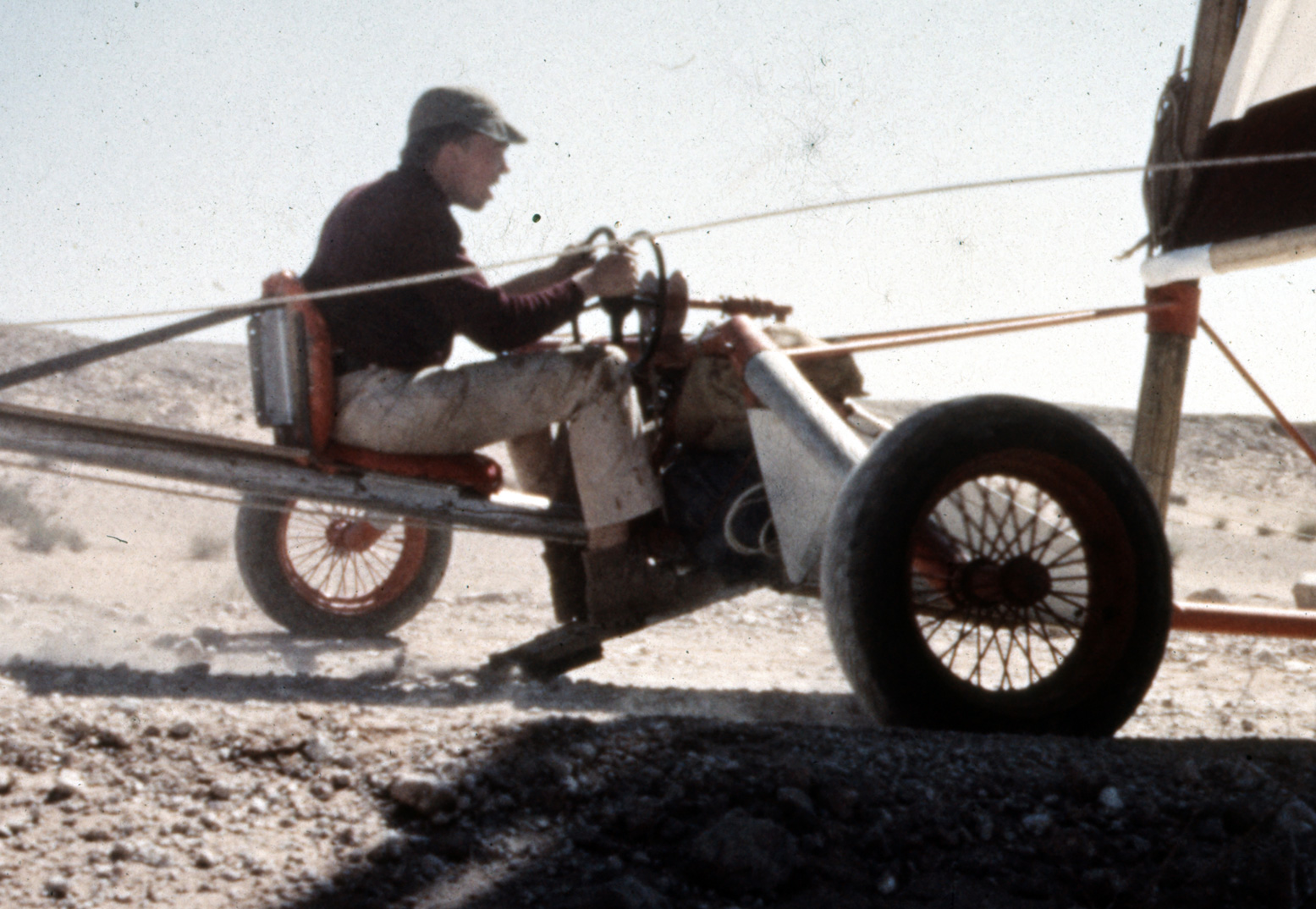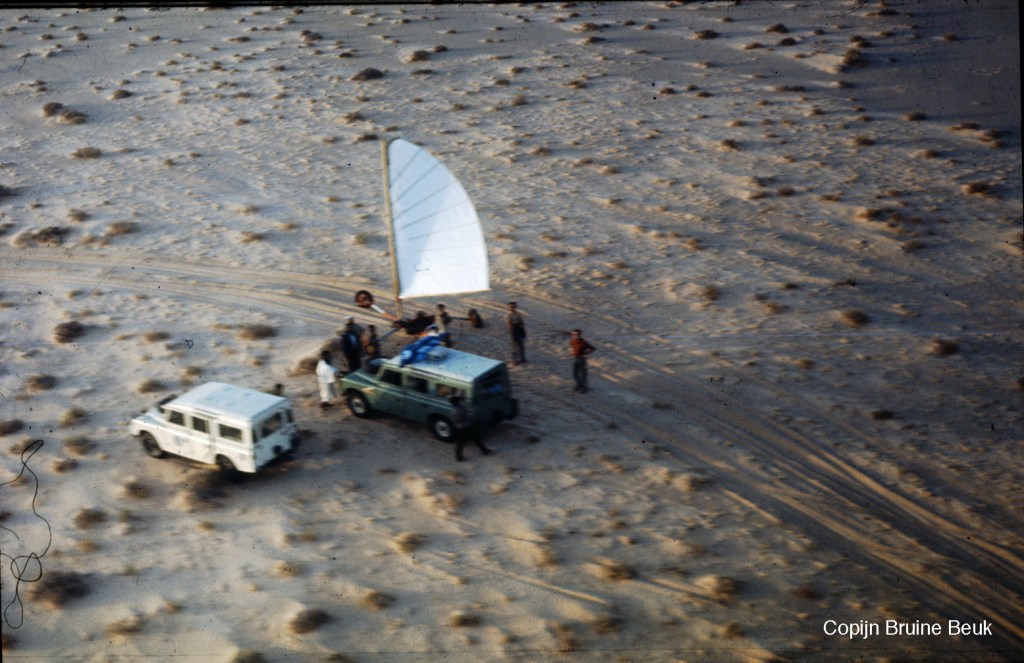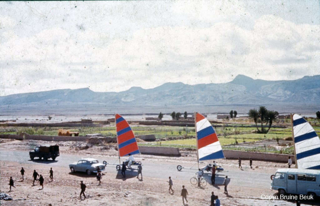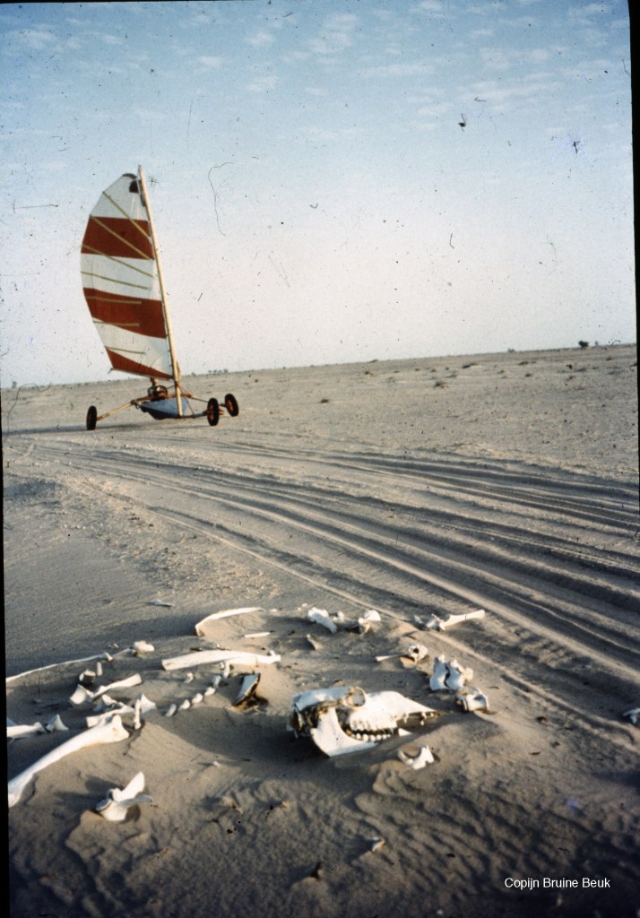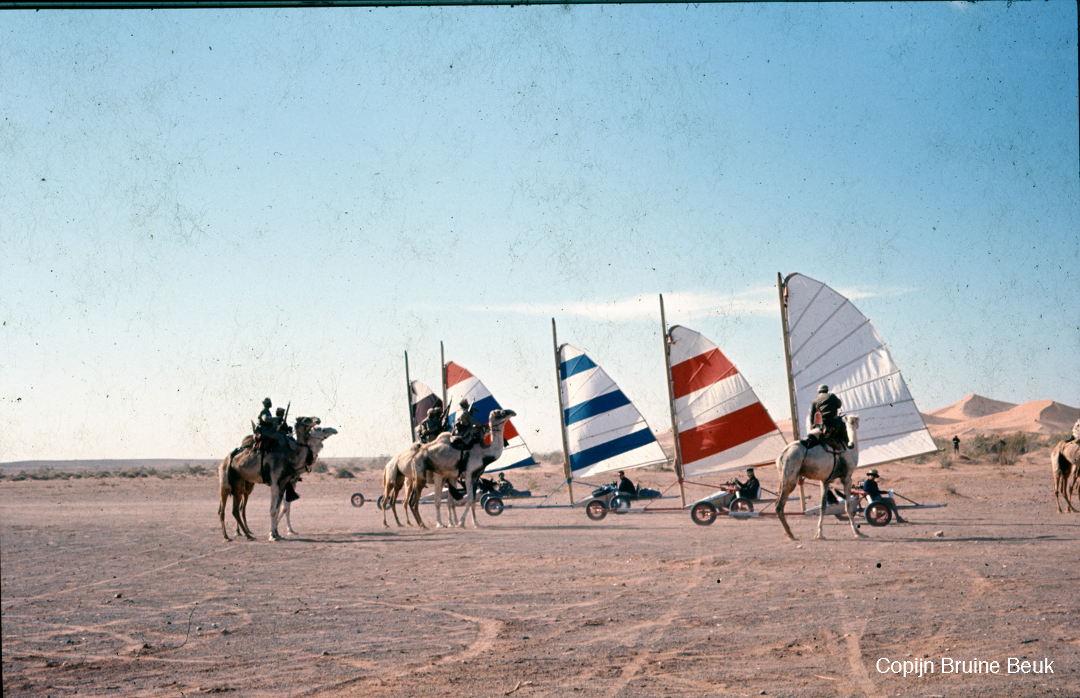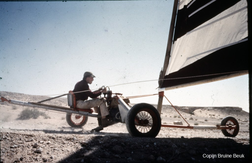 Thanks to Dutch participant, Copijn Bruine Beuk for turning me on to this little-known story and sharing his own pictures of the event (below). Besides hundreds of punctures, as the article recalls, early on Copijn had a close shave with an overhead electricity wire – luckily it wasn’t live. The same happened to a few others who ended up with snapped masts. Once it gets going, a land yacht can hit 60mph or more, but back then brakes added up to little more than a hinged footboard you pressed into the dirt (left), like pressing your feet on the ground to slow an out-of-control pushbike. So you can see why half the field DNF’d. Other hazards included side gusts blowing a land yacht over – February-March were chosen as the time of the strongest northeasterlies. Note also the twin steering wheels: one to steer the front wheel and the other to adjust the sail’s trim: pressing on the footbrake for all your worth, that’s quite a lot to think about when hurtling towards a steep oued bank or into a small dune field. Makes desert biking look positively benign!