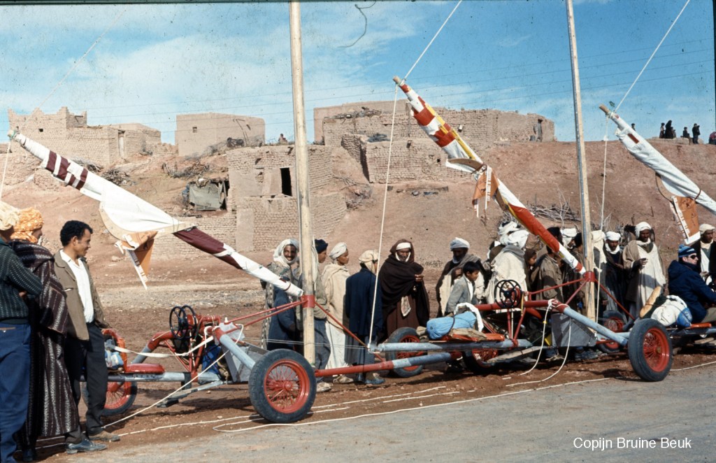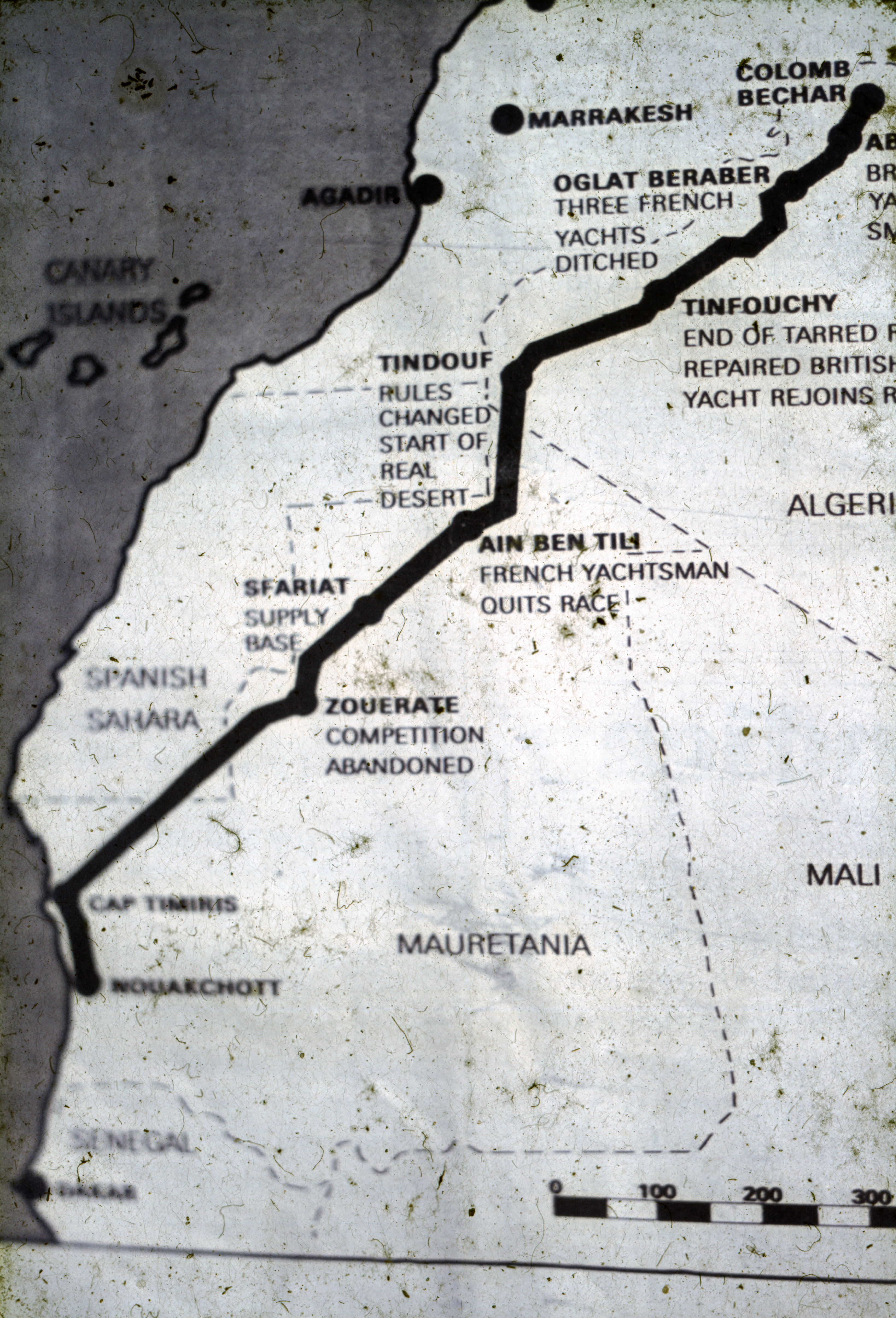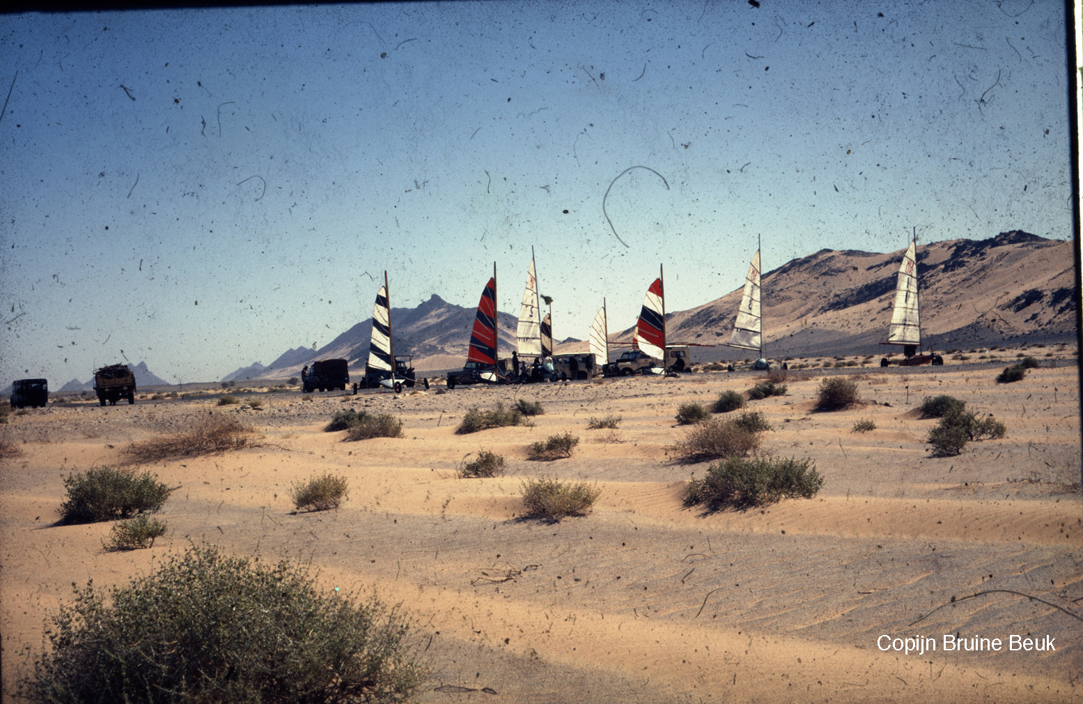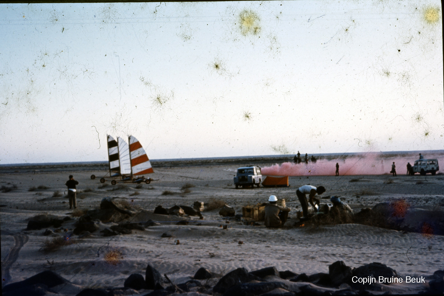Organised by French ex-army Saharienne, Jean de Boucher, in February 1967 twelve land yachts with pilots from half-a-dozen countries set off on a 2500-km rally from Colomb Bechar (then linked by rail from Oujda on the Mediterranean) to Nouakchott on the Atlantic coast, at times following today’s recently reopened Tindouf Route via Algeria. It seems the race element of the rally was abandoned after some 2000km in Zouerat following several DNFs, but some carried on down the coast, cutting across what was then Spanish Sahara (‘PFZ’), on to the beach at Nouamghar and down the beach to Nouakchott. At this time most of Mauritania’s population still lived in the desert as nomads. The rally was supported by a couple Land-Rovers, small planes and surviving French military garrisons with which General de Boucher presumably had good connections.