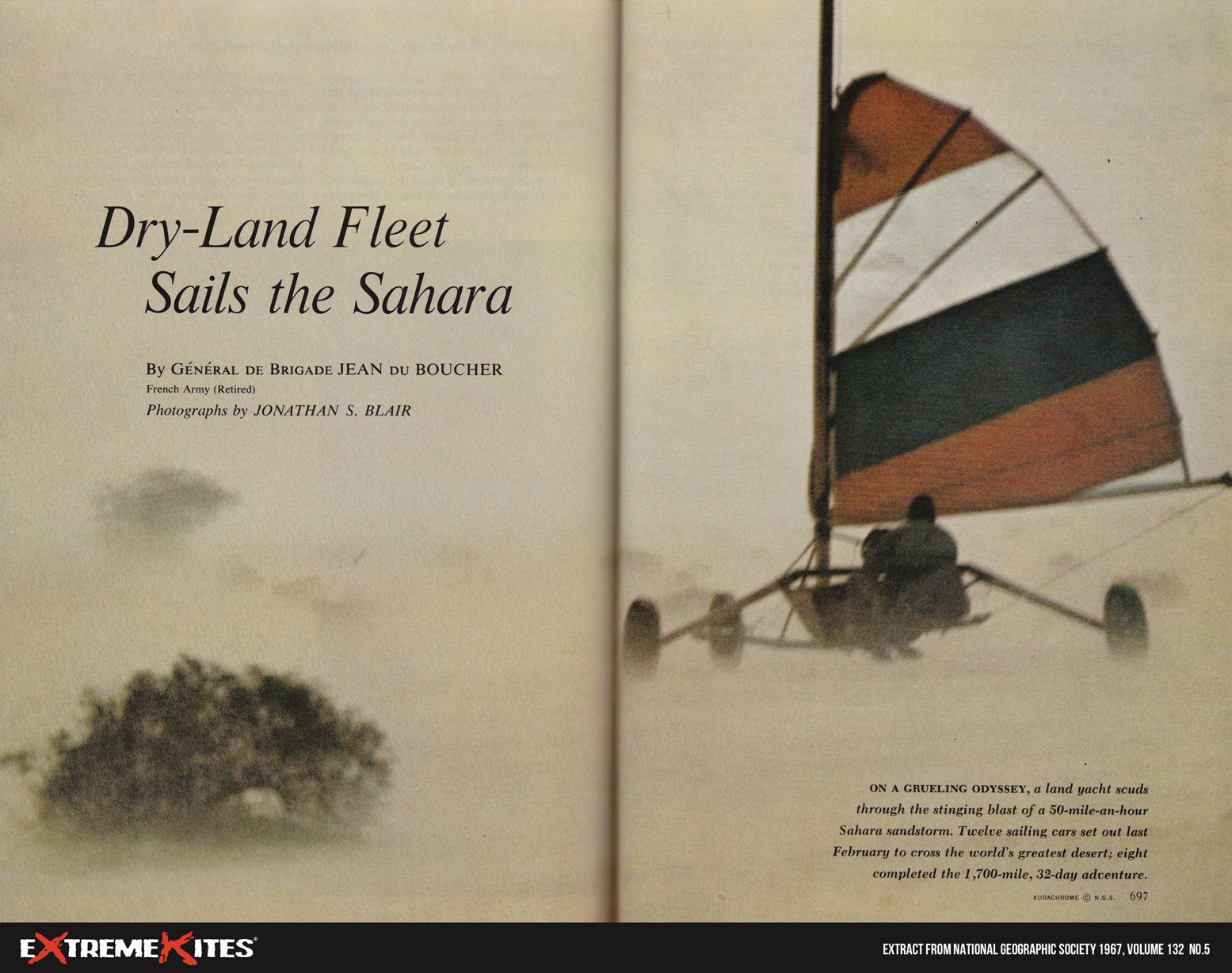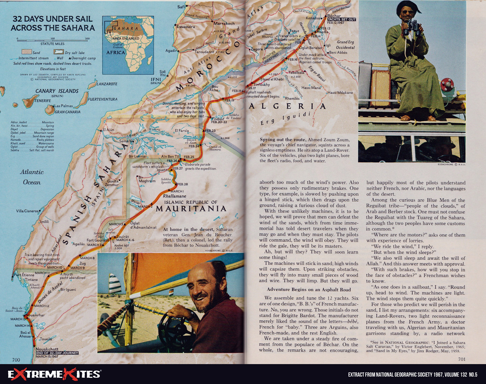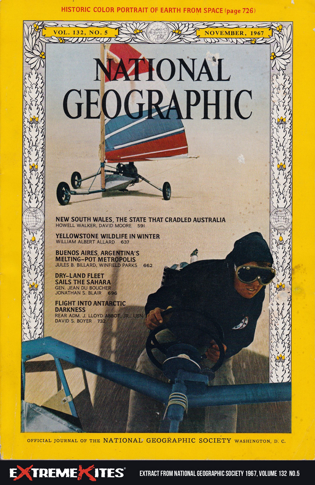 The adventure featured in the November 1967 issue of National Geographic magazine (left, right, below). A couple of images are used here; read the full 30-page article scanned on the Extreme Kites website. There are more reminiscences here by American competitor, Larry P featured on the magazine’s cover.