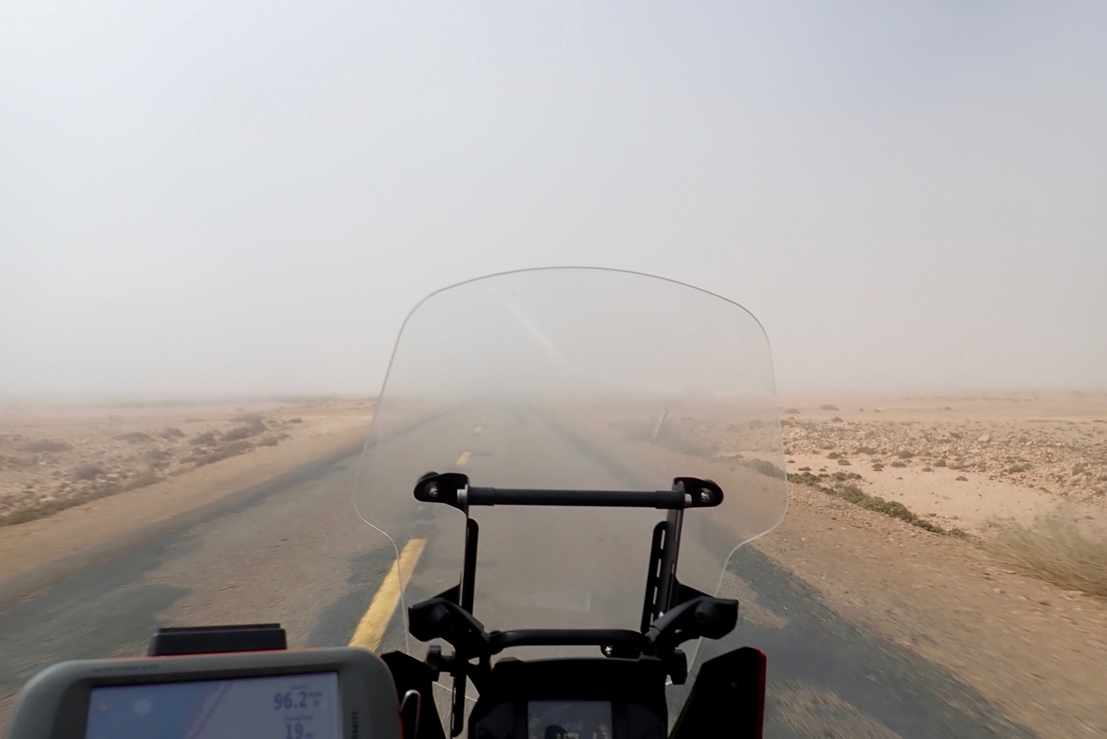 It’s very windy – day and night They say March is especially bad, but south of Guelmim where the desert sets in, it’s windy day and night. Normally in the Saharan interior the wind stops at dusk. In late February 2020 a huge Saharan sandstorm (below) made the news when holidaymakers on the Canaries were stranded. Close to the coast the cold current produces fog (right), certainly between Guelmim and Tarfaya. Within a kilometre of the coast a northerly sea breeze can also blow up to 10°C cooler than an easterly from the dry interior – which might be just a mile or two inland. But generally, the wind is behind you; on a pushbike (I saw a few), that’s important.