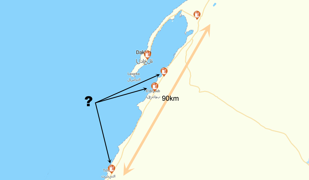 The longest fuel range is 162km but may be 250km This is between Tchika (Imlili) near some big white barchans on the north edge of the Gulf of Cintra, and Bir Gandouz, the last town, 80km from the border. There is nothing at all along this section except the howling wind. However, the Tchika station and the two similarly old and grubby Atlas Sahara stations to the north near El Agroub (see map right) may be empty. Stations may get upgraded, but for the moment this means from Dakhla Junction roundabout (two fuel stations) to Bir Gandouz is 252km (via the Tropic of Cancer). I covered that distance northbound into the wind and go in with a pint in the tank.