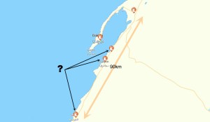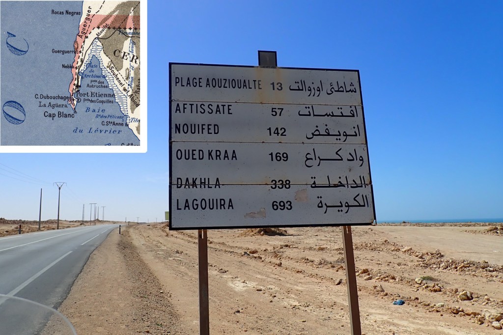 What is ‘La Gouira’ you see on the road signs? The ‘Lagouira’ you’ll see listed on some old Atlantic Highway road signs indicates the short-lived Spanish base at La Agüera on the Ras Nouadhibou peninsula opposite today’s Nouadhibou. See map inset below. Effectively it indicates the distance to Nouadhibou which is not always listed. Abandoned at the turn of the century, today it’s a collection of ruins which are actually in the Polisario Free Zone, commonly mistaken for No-Man’s-Land which separates Morocco from Mauritania. Some have managed, but the Mauritanians won’t allow casual visits from the Nouadhibou side.