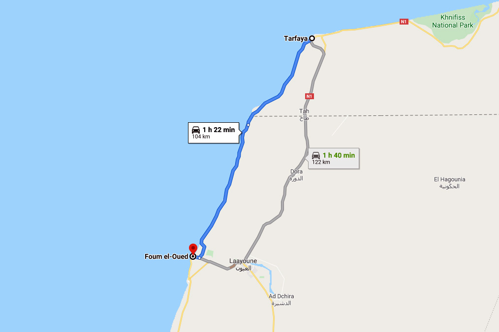 The Laayoune bypass At Tarfaya (former Cap Juby) you can turn into the town, head for the shore past the St Exupery museum, his monument, and the 19th-C curiosity of Mackenzie’s Factory). Following the coastal road 90km to Foum El Oued (‘river mouth’) brings you back to the N1 just south of Laayoune city. It would be nice to report this is a quiet byway passing idyllic beaches, but the wind is ever-present and trucks use this narrow road to avoid Laayoune. Dunes also get bulldozed off the road, especially south where the road gets narrower. I suppose it might be cooler than the inland route and the beached Armas ferry is a site to behold. There’s more here.
