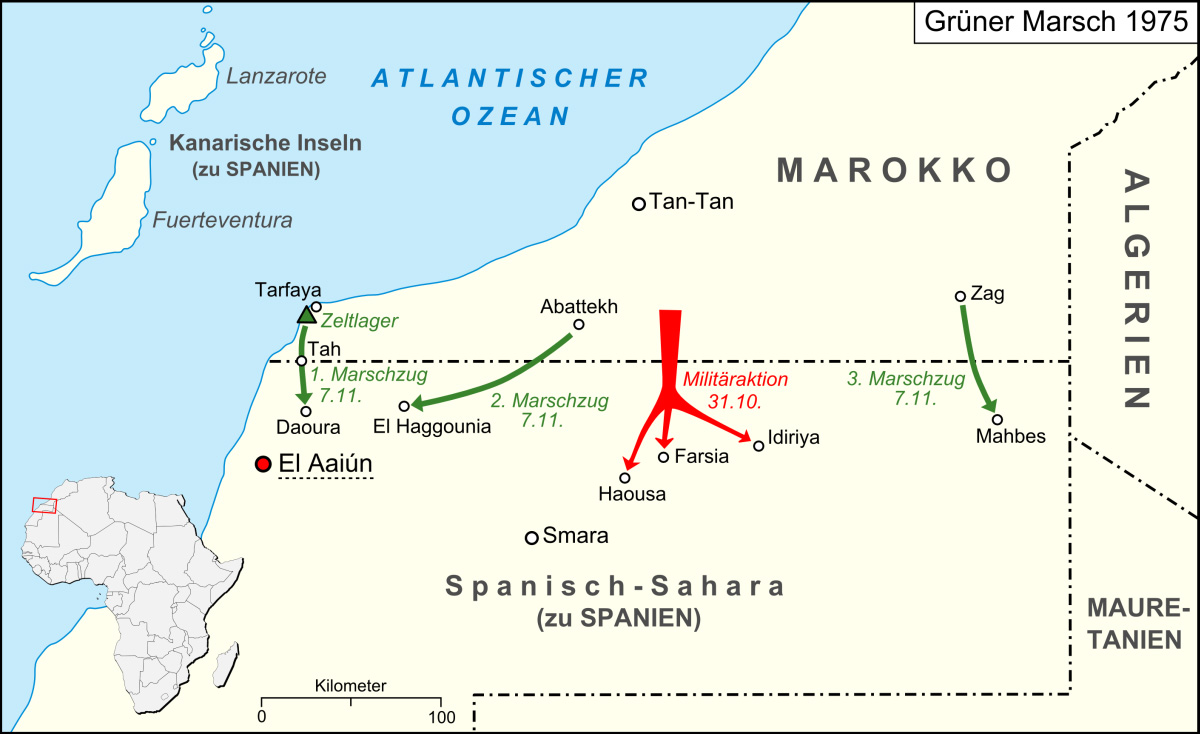 This was the Green March (map left): three co-ordinated and tactical mass demos mobilised by the wily King Hassan in response to rumours of Spain considering handing over its marginal colony to the indigenous Saharawi and Polisario Front. The marches were followed by the 16-year Western Sahara War which Morocco effectively won by annexing most of the territory (see map,above). It’s why the UN still hang out in Western Sahara and why unmapped landmines are still a menace. Otherwise, not much appears to have happened in Tah since that glorious November day.