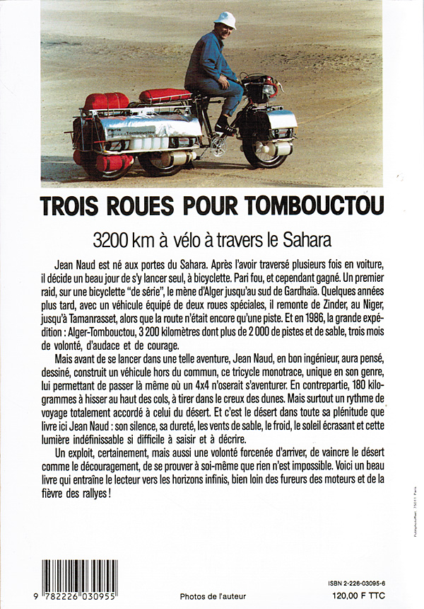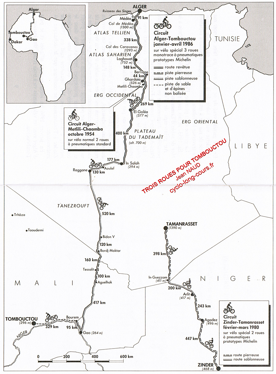 Jean Naud died in 2011 aged 80. You can find his 1987 book covering all his Saharan cycling adventures, on amazon France.