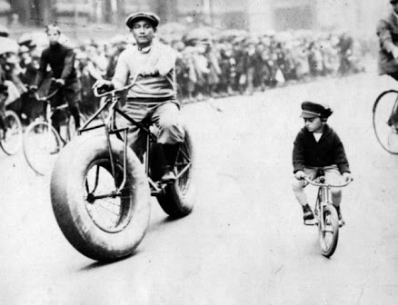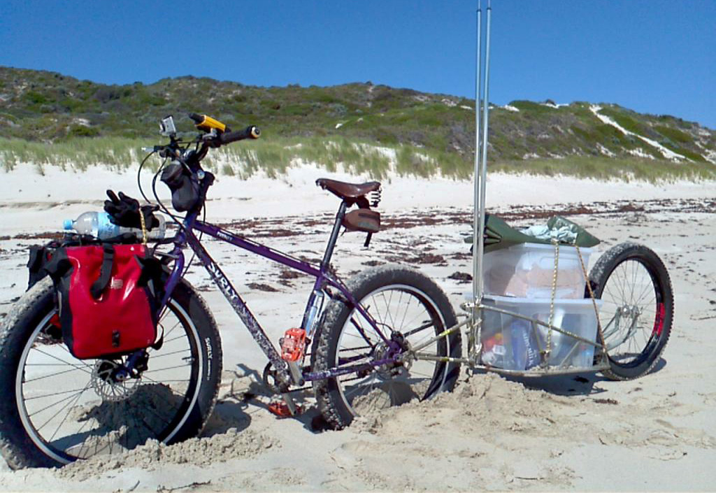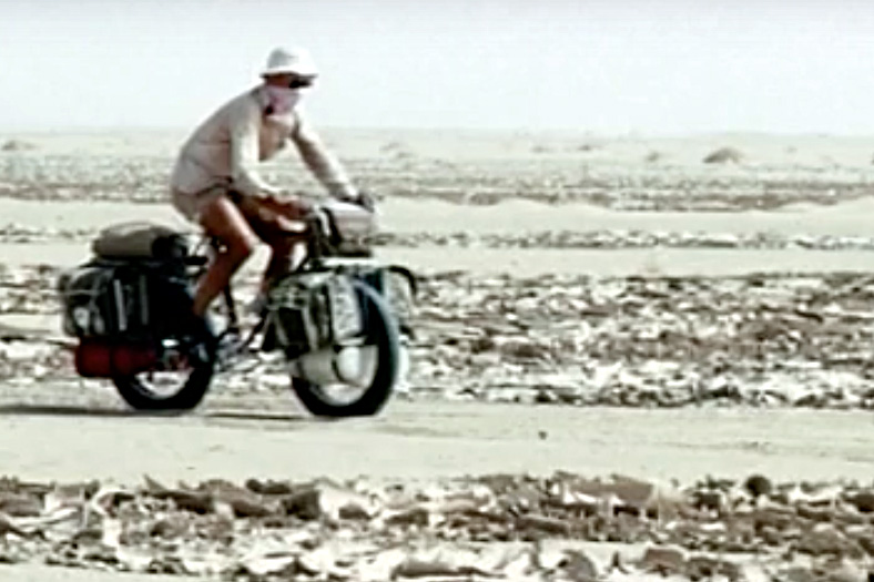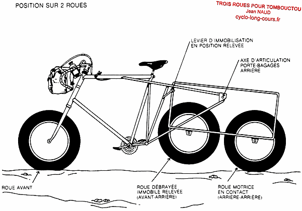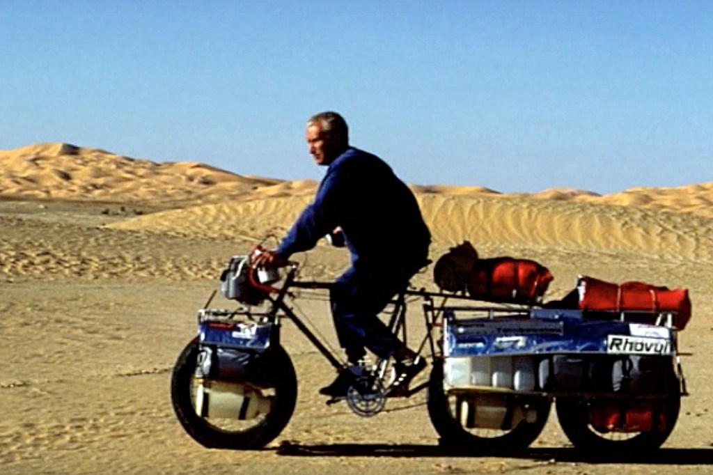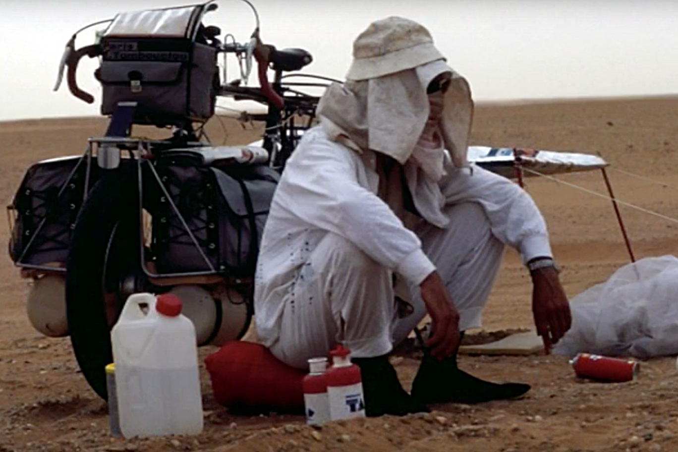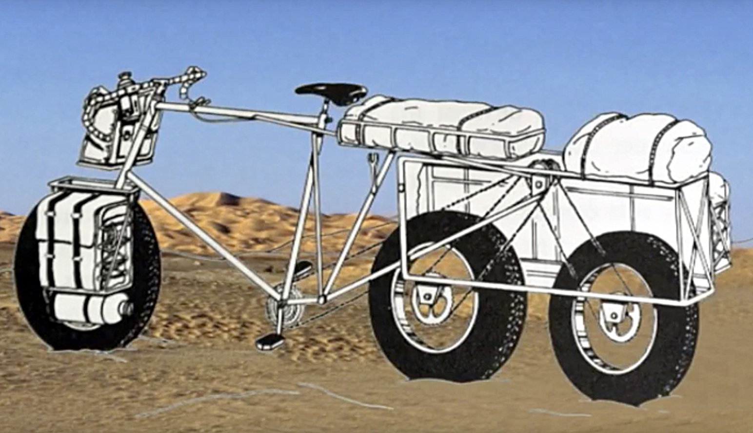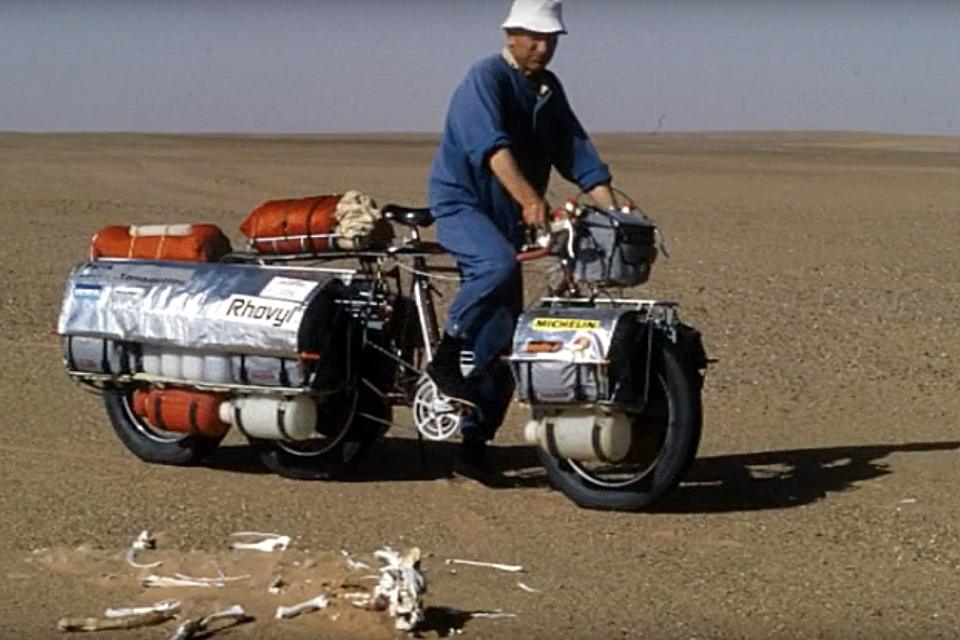 In 1986, long before the current fat-bike fashion (left), Jean Naud, a 55-year-old Frenchman set off to ride his three-wheeled bicycle 3200-km across the Sahara from Algiers to Timbuktu.