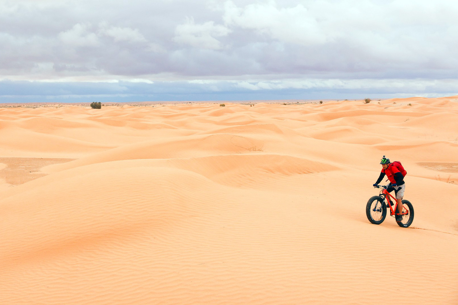 Although the Sahara isn’t all a wasteland of soft sand dunes, the thin tyres of a regular bike would easily sink or damage the rims on rocks under the required loads needed for desert travel. I’ve met the odd cyclist in the Sahara. The big problem with off-highway pushbiking is the load needed to maintain autonomy, not least, water. On a conventional bike it’s barely possible without relying on passing traffic, because the tougher the terrain the greater your water consumption. Even in winter in the central Sahara, I’d guess you’d need five litres to cover about 60 kilometres on a sandy piste. And that would be a long day.