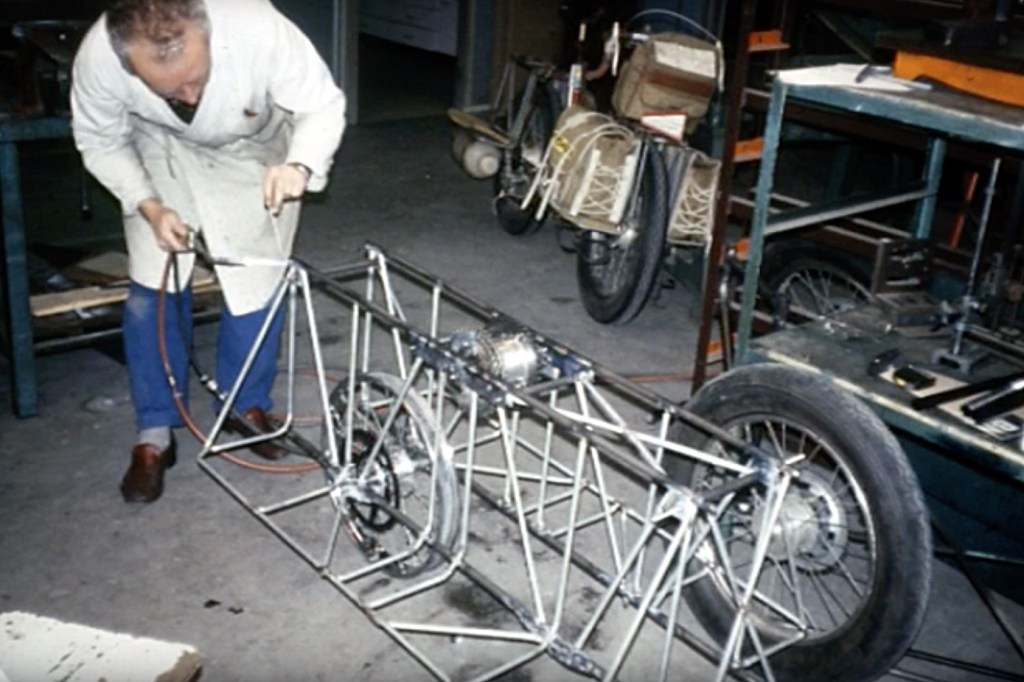 Using the modern Bob trailer on a fat bike (left) is a similar and probably more efficient solution. The added effort in towing the loaded-down third wheel, rather than powering it as Naud’s 2WD bike could have done, is negated by the weight savings and the lower centre of gravity. You get the feeling Naud was merely experimenting with novel engineering solutions, as he discusses in the video below.