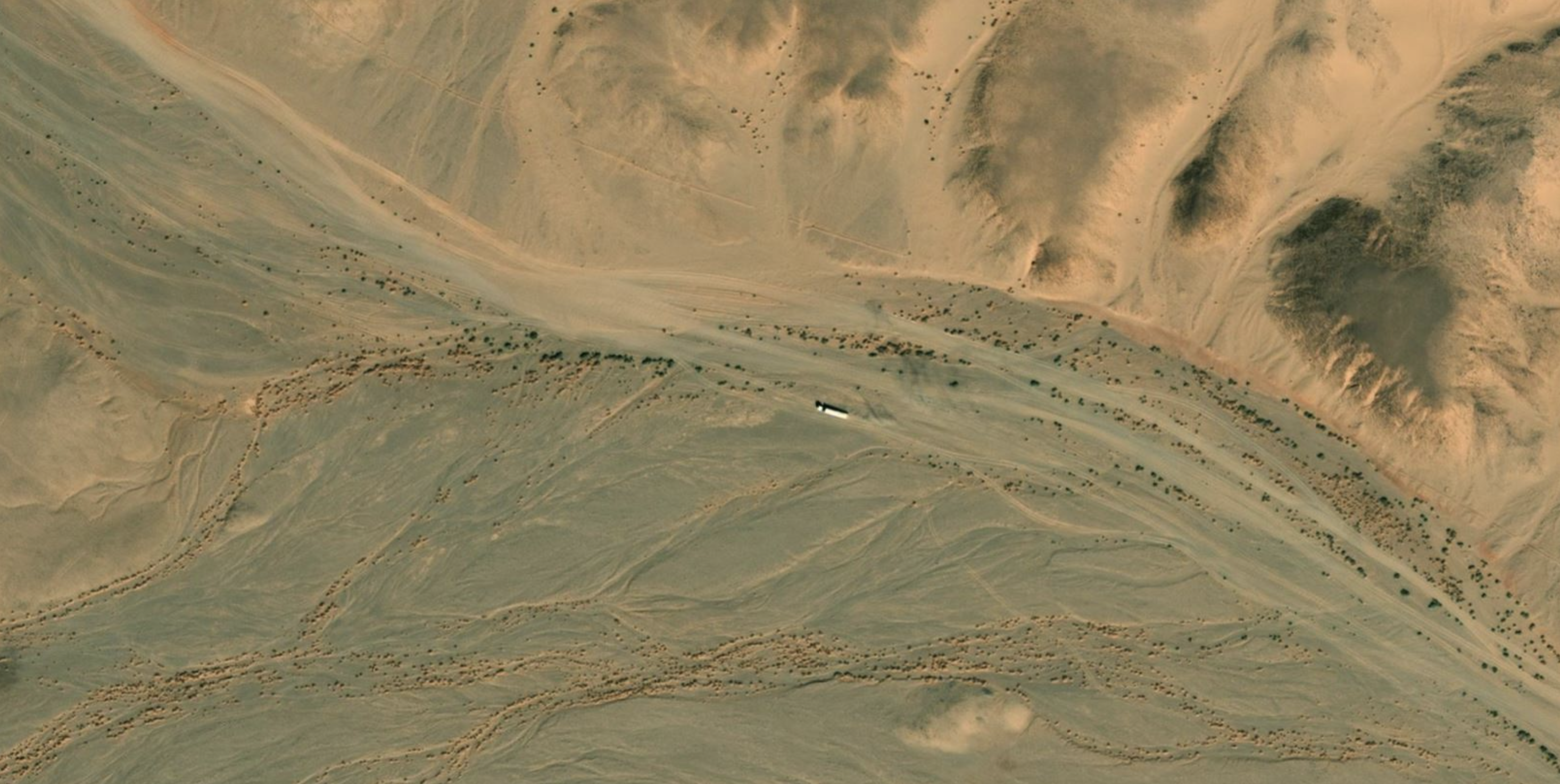 The answer seems to have been an attempt to seal it’s southern borders with a series of double berms (car-blocking sand walls) integrated between impassable natural topography, just as Morocco has done in the Western Sahara. These berms (below, black) are backed up by border access and patrol roads (red, below), and scores of bases, some with huge runways (left). They run near continuously from the In Amenas area south of Ghadames in Libya all the way round to Bordj Moktar and beyond. West of there towards Tindouf the Erg Chech acts as a natural berm.