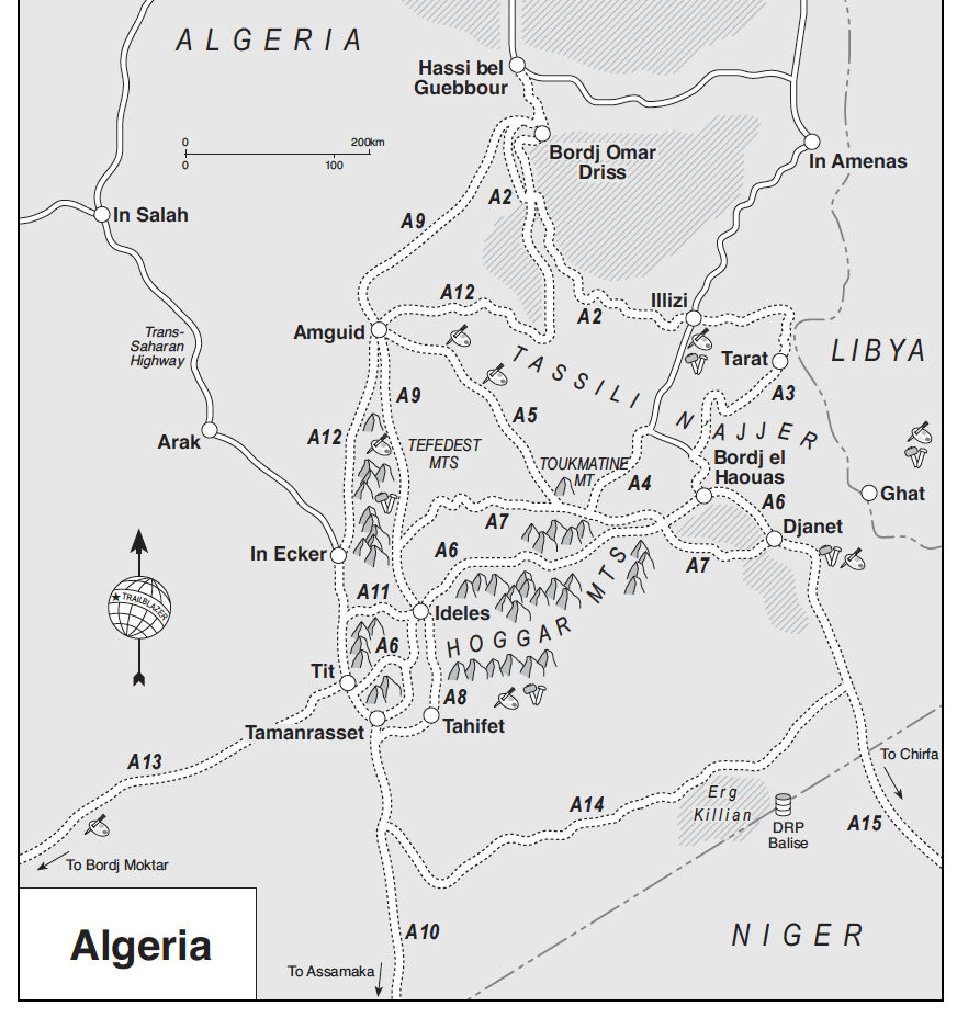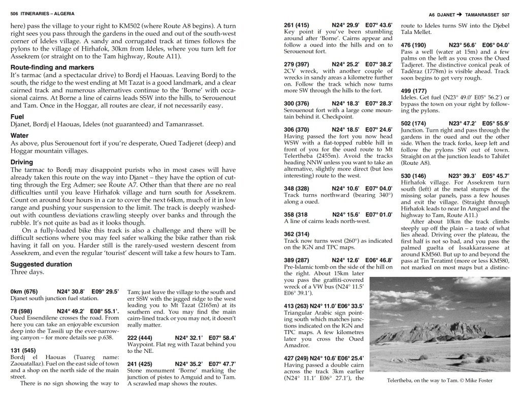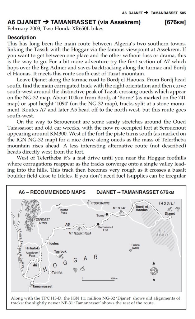 Route A6 In the good years (70s & 80s and 00s) the various tracks between Djanet and Tamanrasset and Hoggar mountains all combined to make classic multi-day adventures in southern Algeria.