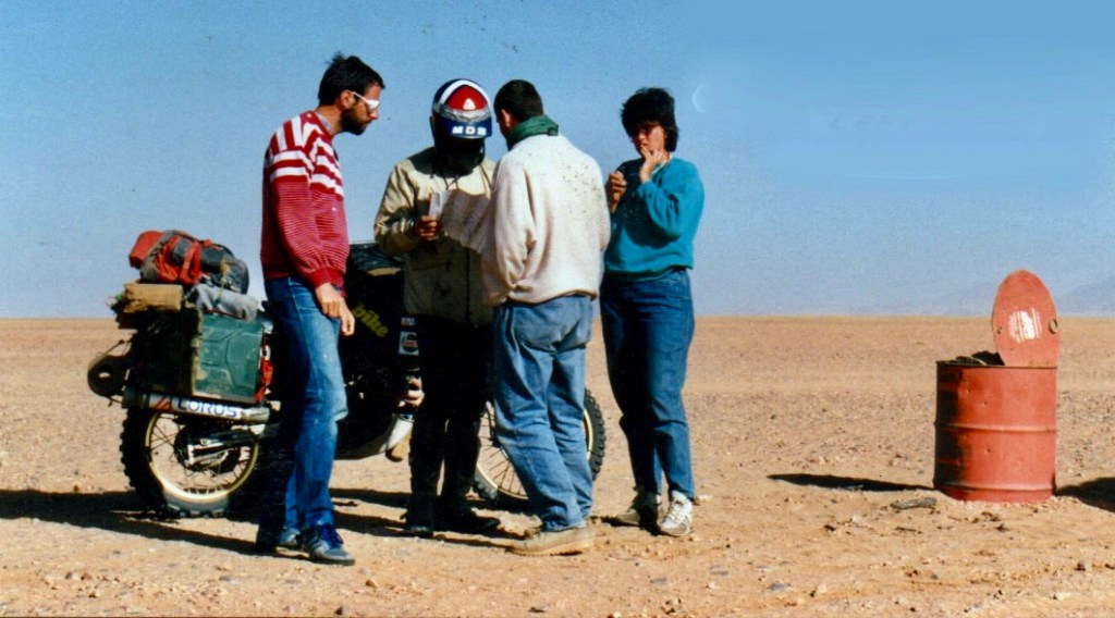 Passing isolated volcanic cones, plugs and other outliers, the basalt rubble of the once molten Hoggar lifted you up to Assekrem, a few hours from Tamanrasset and a refuel. The main route used by non-clandestine locals (A6 in my old Sahara Overland guidebook bottom of the page) was still nearly 700 kilometres or two desert nights for most. It was also on the limit of what an moto could manage.