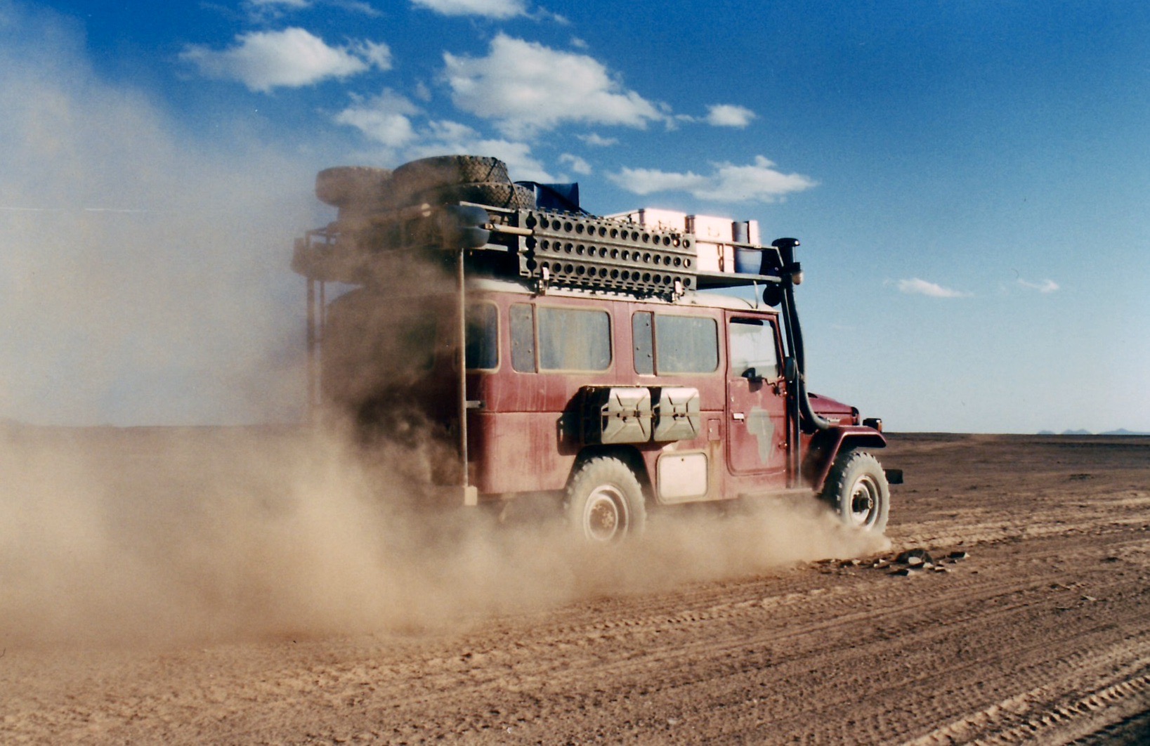 Despite these challenges, the journey through the harsh and beautiful landscape was a memorable experience. The great silence when they took a coffee break or ate beef straight from the can was indescribable. Then they’d sit in the sand with their feet in the ruts while the fiery red sun set, as it only does in Africa. When they got tired, they would burrow into the sand and look at the billions of stars overhead.