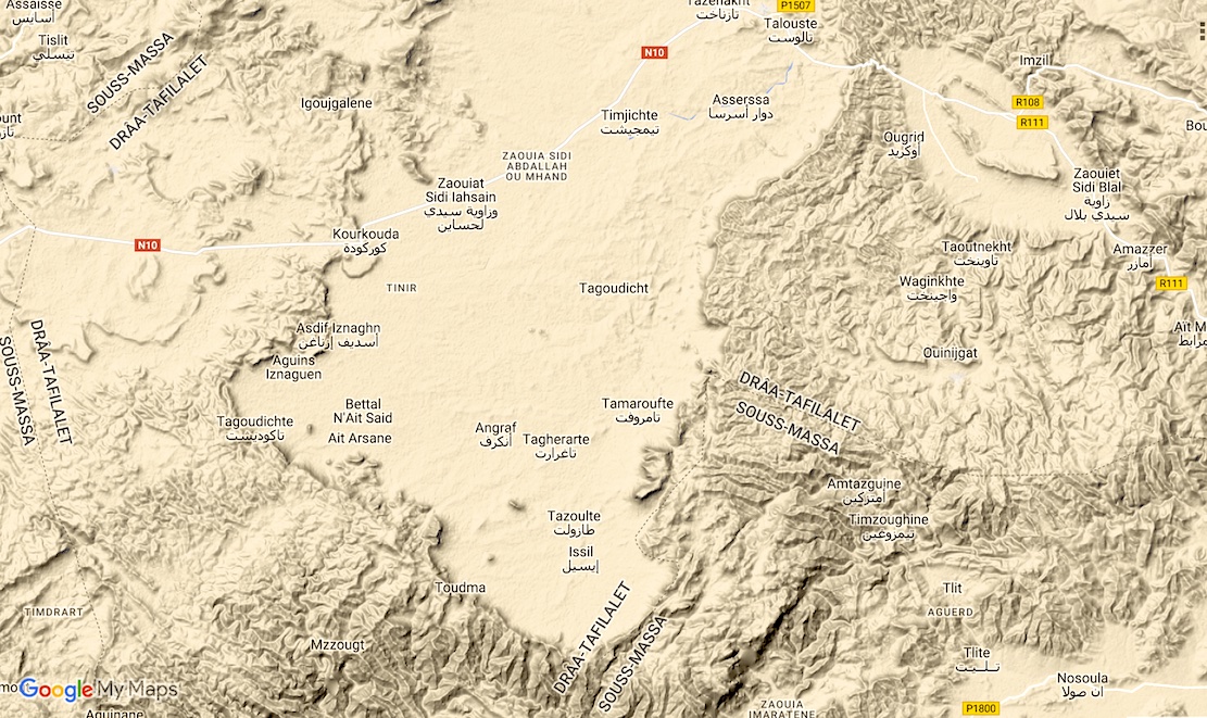 The new book out this week has a bunch of great routes in the A (Anti Atlas) region crossing the Issil Plain which lies between Tazenakht and Taliouine. Both are good bases to kick off a traverse of the plain towards (or from) what I used to call Jebel Timouka but might more correctly be called Jebel Tawzart – an escarpment which rings the plain to the south. These routes cross six passes or Tizis labelled below. From the west Tizi Ounzi, Tizi Tarslemt, Tizi Tawzart, Tizi Haroun, the unnamed ‘Issil pass’ and the Tizi Mourirt which is not on any M4 route but is worth a look and is part of the RoC.