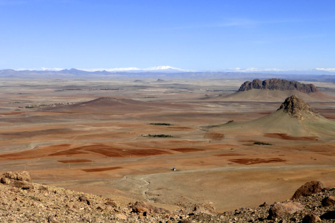 Looking north from the Haroun Pass across the ochre expanse of the Issil Plain to the snowy High Atlas