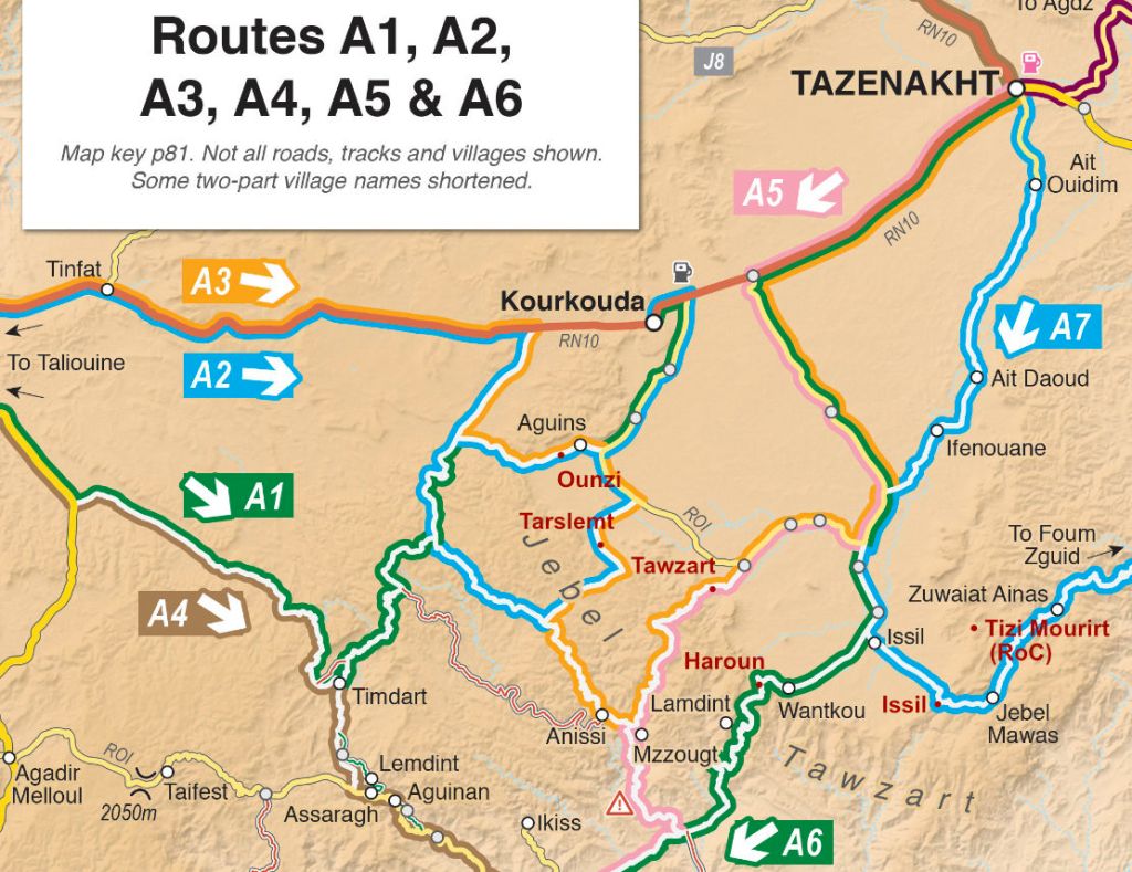 Tizi Tawzart 1940m (Routes A3, A5) Tawzart takes a steep line up the jebel from Algouz and consequently got damaged by the recent rains: big bikes may struggle. And as you’ll read in the book, all vehicles may struggle trying to follow Route A5 right down the Anissi canyon. On A3, once you get to Anissi, the track gets more maintained to the west.