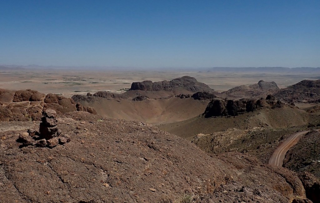 Tizi Tarslemt 1896m (Routes A2, A3) The Tarslemt starts as a broad ramp rising up onto the jebel with great views over the plain before swinging through a few switchbacks to nearly 1900m and down the far side and the canyons beyond