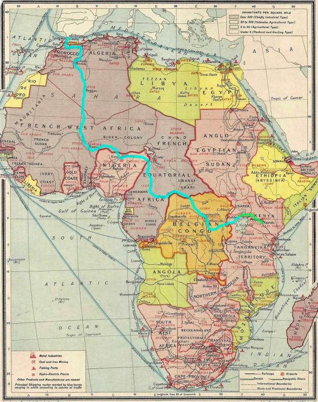 The direct route was via Sudan and Egypt [with the option of putting the car on a train across the desert from Khartoum to Wadi Halfa], but Egyptian President Nasser was in the process of kicking the British out (the Suez Crisis occurred in 1956). Meanwhile Sudan was also wearying of the British and refused permission to transit the country. The only alternative led west across the Belgian Congo [today’s DRC] and on through French Equatorial Africa [CAR, Cameroon], British Nigeria, French West Africa [Niger] to Algeria and Tangier in Morocco.
