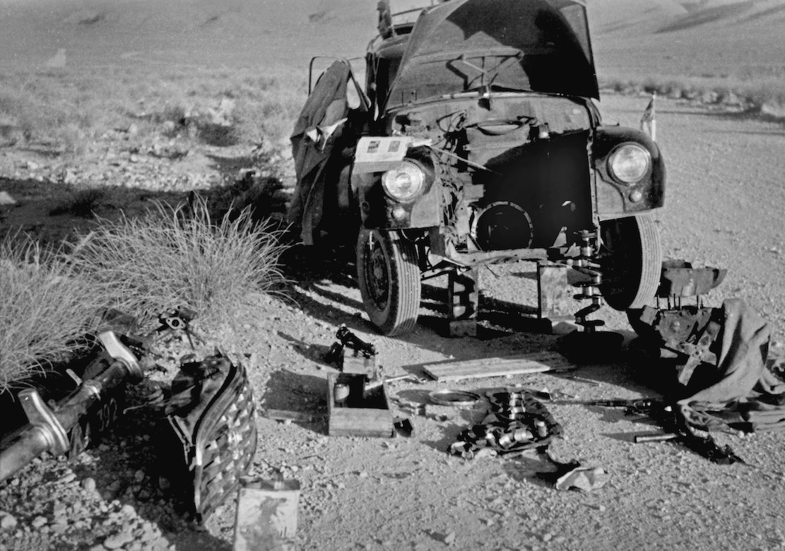 Major repairs in the Sahara Every now and then the engine would cut-out due to vapour-lock in the fuel pump struggling in the immense heat. Cooling it with a wrapped wet cloth helped a little, but the engine was also losing power and knocking loudly until they could only run for 3km at a time. Now the spare parts they brought from Uganda became invaluable. The engine was removed and disassembled in the desert and a destroyed main bearing was was replaced with a lot of filing and hammering. It took hours, but when the car started on the first try, the proud smiles lasted the rest of the day. The broken spring still had to be re-tied constantly, but after seven days they finally reached Reggane with a hotel and a proper meal.