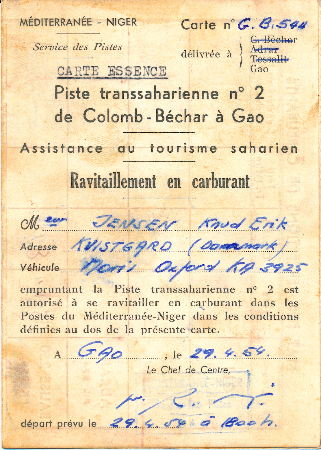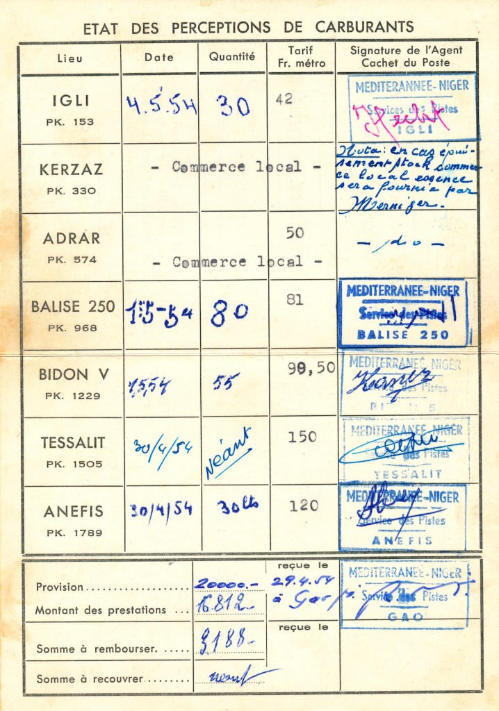 After 6000km and three weeks on the road, the two exhausted Danes reached Gao on the Niger river [present day Mali], the southern terminus of the 1800-km Tanezrouft piste across Sahara to Algeria [the route of the original crossing of the Sahara with Citroëns in the early 1920s]. Here they met four Englishmen in a well-equipped 4WD, one of whom was a mechanic. They’d driven up from the Gold Coast (a former Danish colony, today Ghana) but had already blown four tyres. Although their original plan had also been to cross the Sahara, they’d lost their nerve and planned to sell the car and fly home.