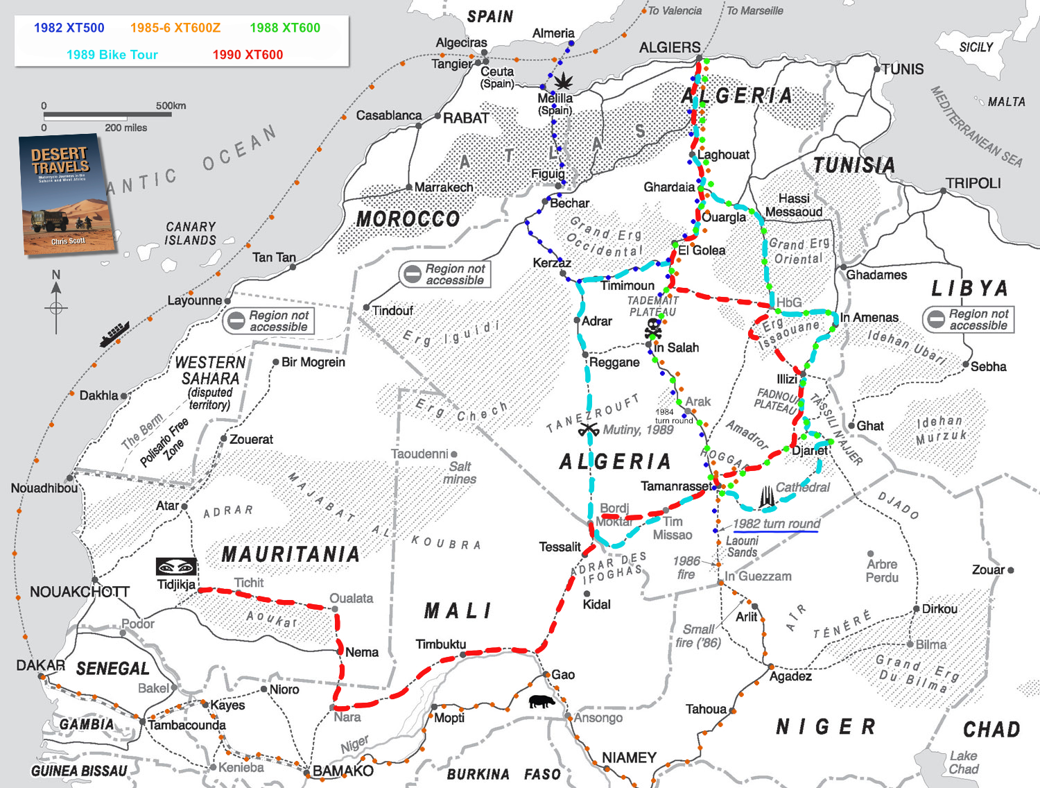 Most of Desert Travels describes my ‘Sahara Motorcycle Tour’ of 1989. On that occasion I managed to scrape together five guys to follow me and a cantankerous Land Rover support vehicle for a month deep into the Algerian Sahara. Like it said on the back of the original book: five set off from the UK; only one came back riding. See map.