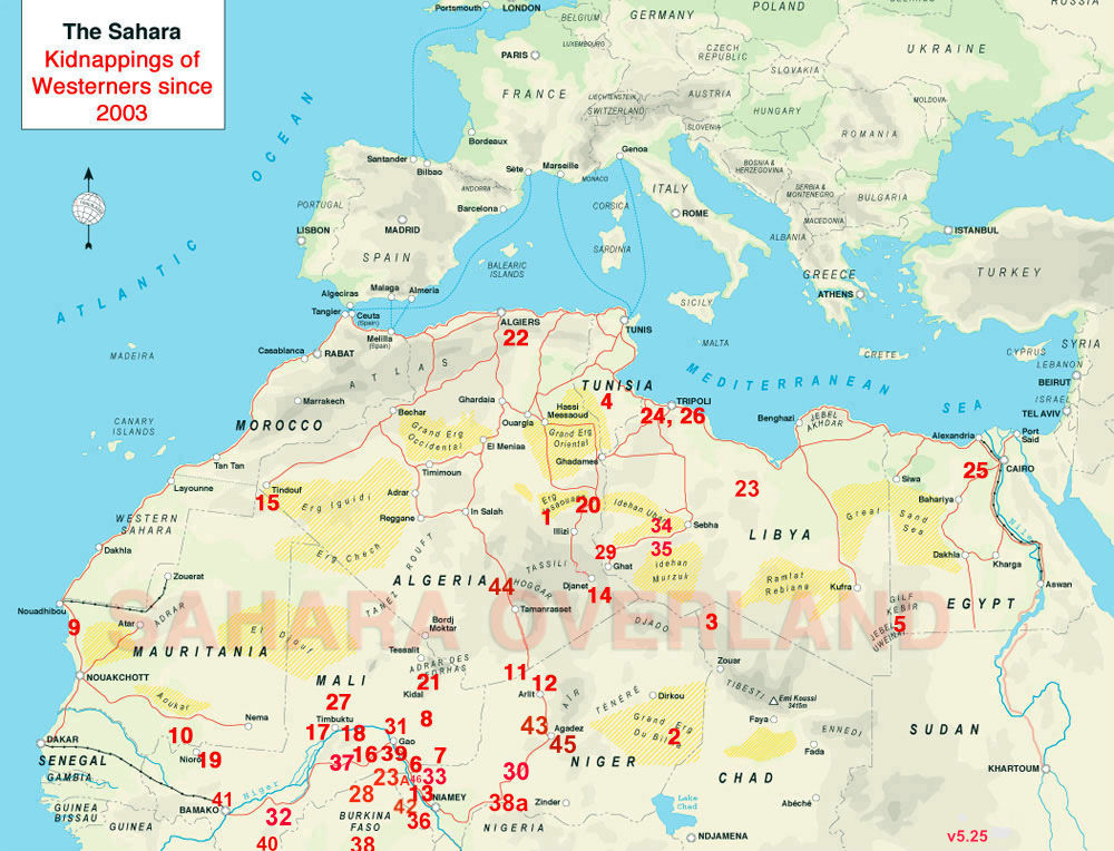 The map above and list below identify the dates, locations and outcomes (where known) of reported kidnappings of over 150 Westerners for lucrative ransoms dating from the first such event in Algeria in March 2003 (#1).