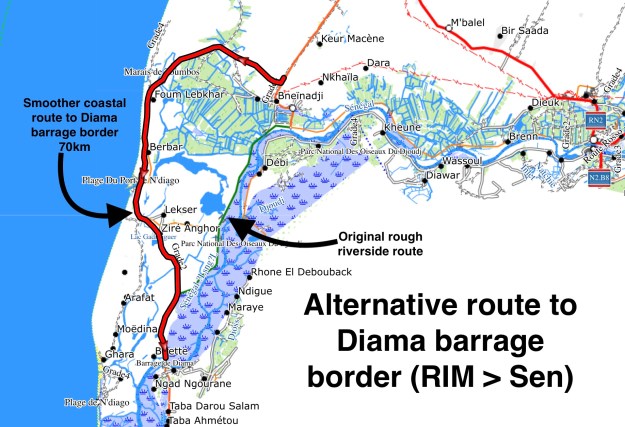 You leave the N2 highway way north of Rosso. The riverside road to the southwest is sealed for the first 20km, but after that gets famously rough. the map below shows an altertive coastal route to the border which is longer but less rough. More info on 2026 border procedures here.