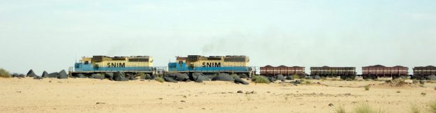 Near the very end of the crossing you pass through some berms, then near a mine you join tarmac at 22.8267, -12.3708, 15km NE of Zouerat. This is a rough iron ore town where checkpoints will direct you to register your vehicle at Customs (see Google map above or 22.7388, -12.4708). You might try and buy a SIM and exchange money at a better rate than Bir Mog. Petrol is about 50 oogs a litre. It might also be possible to put your vehicle on a train to Nouadhibou on the coast.