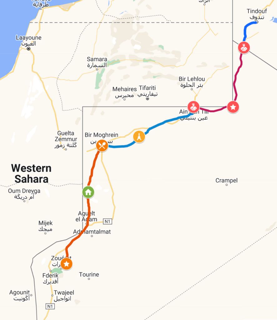 When Algeria initially announced the plan for a new trade route between Tindouf and Zouerat in 2018, Morocco quickly responded with intentions to tap into that route by extending asphalt the relatively short distance from Smara, south through the Berm to the border just below the 26th parallel, about 100km north of Bir Mogrein on the Tindouf Route.