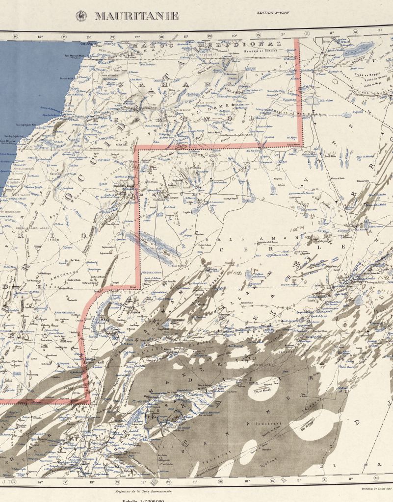 During the French colonial era the Tindouf track was known as the Piste Imperiale N°1 (below), the principle trans-Sahara route linking Algeria with Dakar in Senegal. Today’s Atlantic Route in Morocco was then in the adjacent colony of Spanish Sahara. The Tindouf route was closed in 1963 by which time both Algeria and Mauritania were independent from France. This 1965 book dramatically describes a transit in 1959 as wars of independence raged.