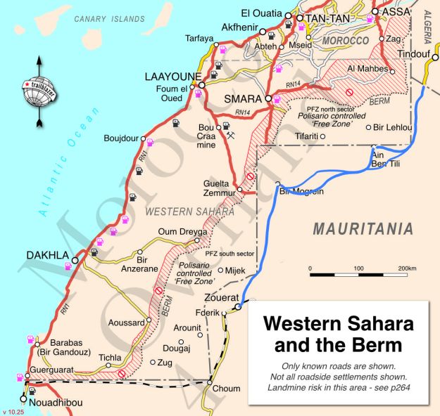 Whether Morocco and Mauritania actually need another border crossing to join with the long piste to Zouerat is debatable. It’s hard to think what commodity or trade in either direction doesn’t benefit from using either the fully sealed Atlantic Highway, or shipping along the Atlantic coast from the expanding port at Dakhla. The distance from Nouakchott to say, Guelmim is the same, except the new route would have a 400-km corrugated gap in the asphalt from the border via Bir Mogrein to Zouerat the iron ore railhead to the Atlantic.