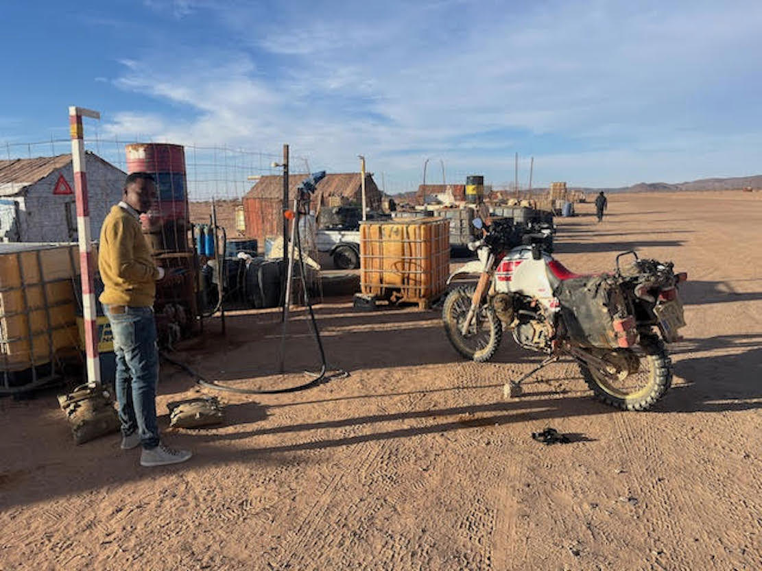 From Ain Ben Tili Camp (KM300) fort it’s 240km to Bir Mogrein. There are telecom masts (left) every 30km or so which have become informal way-stations where entrepreneurs sell water, food and maybe fuel.