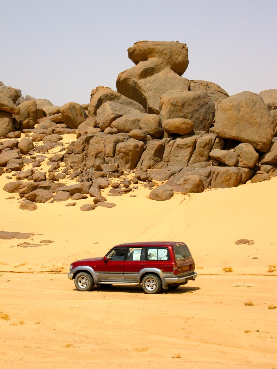 We took the high route to Bordj out via Abalessa, through the still-muddy oued and out onto the wide open Tanezrouft, passing a pre-Islamic tomb (right) on an isolated hill. It’s funny how I can spot these easily now. On my first Sahara trips just hanging onto the bike was hard enough. The hot run out across the Tanezrouft unrolled, and a day later dusty Bordj didn’t seem to have changed much over the years. We checked out of Algeria. We’d be checking back in shortly, but – ahem… – sans voiture.