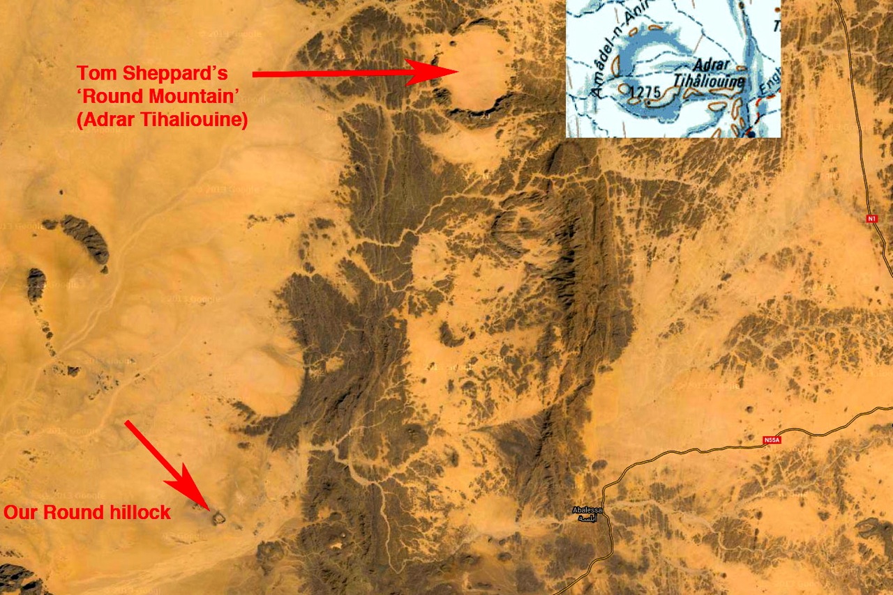 Next morning we visited a crater hill. Years ago I remember reading an article by Tom Sheppard about his quest to reach a curious crater formation he’d spotted northwest of Tam. ‘Journey to the Round Mountain‘ he called it, riding there on his XT600 Tenere. That was probably Adrar Tihaliouine to the northeast, and this similar crater reminded me of it. A good place to stash rustled camels!