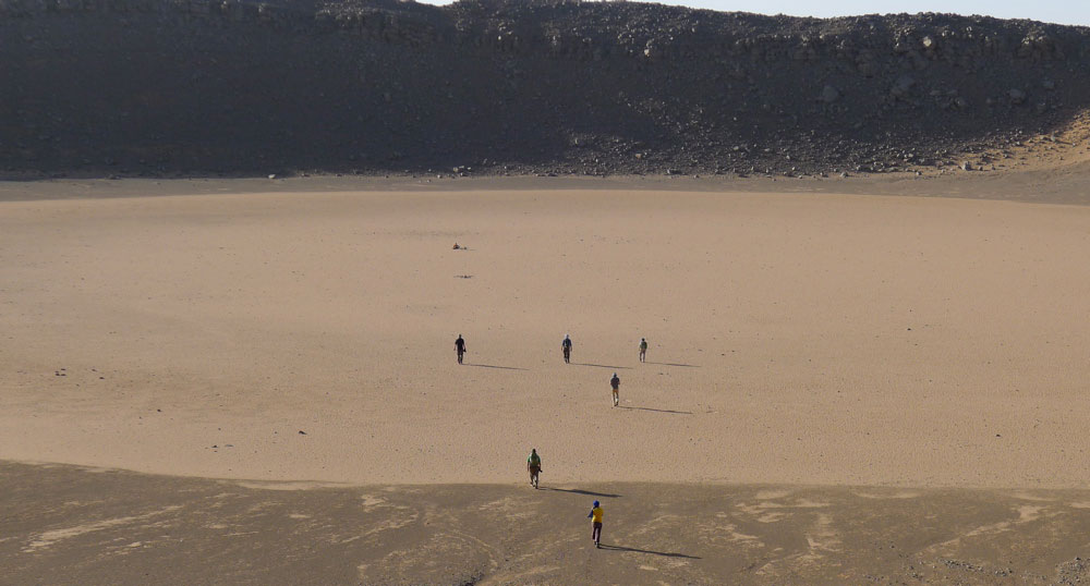 After lunch we continued for half a day up the sandy Teganet oued (right) in the direction of Bir Outene at around 200km (see map). Here we had a day off waiting for the cars to arrive, as we’d saved a day taking the new route to the crater.