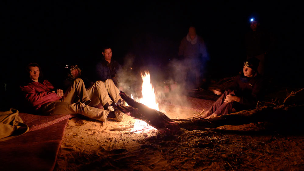 That night’s camp at around 2200 metres was a grubby oued just short of the Assekrem track. This time we scoured the vicinity for scrub to burn, and using the oued bank wall, managed to keep ourselves warm under blankets (left) until Tayub brought over the dinner. Once the tea was served, we all made a dash for our sleeping bags.