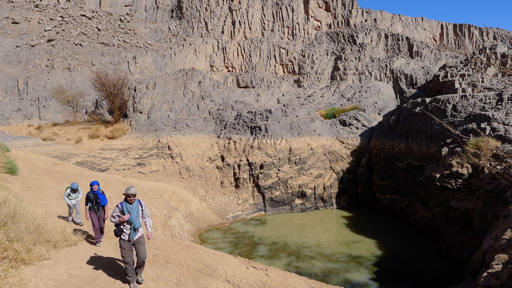 The secret of a good group is that they remain cheerful even after a grim night where few had slept well. Some had crawled in to share tents, and others had their tents snap over them, making an even worse din. Breakfast was delivered with stuff flying past and we then set off down the valley. Soon we joined the main, eastern arm of the car track to Assekrem which we followed briefly and then turned off at the twin ‘Mac D’s’ arches for the guelta at Afilal.