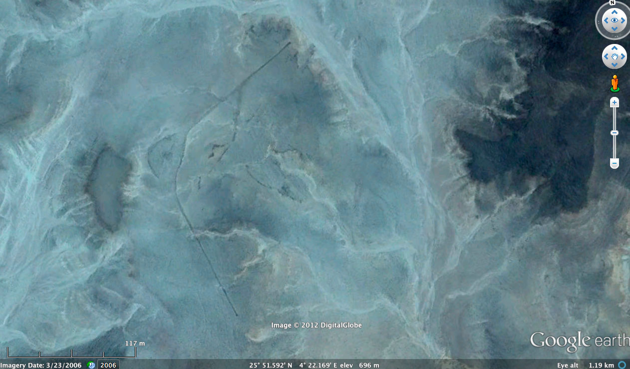 More sparkling gueltas and even flower-clad lawns led to Camel Branding Camp V along the south edge of the Tissadert escarpment. This place is surrounded by ancient tombs, many of which have been annotated on Google Earth by ‘Ken Grok’. There’s a ‘keyhole tomb’ a couple of minutes from camp (above left), another 700 metres away which we passed close by later, but the strikingly huge antenna tomb (right, on GE) I led us to with the GPS was so big it was hard to visualise at ground level.