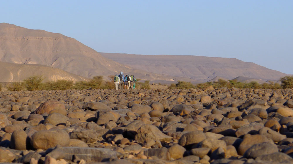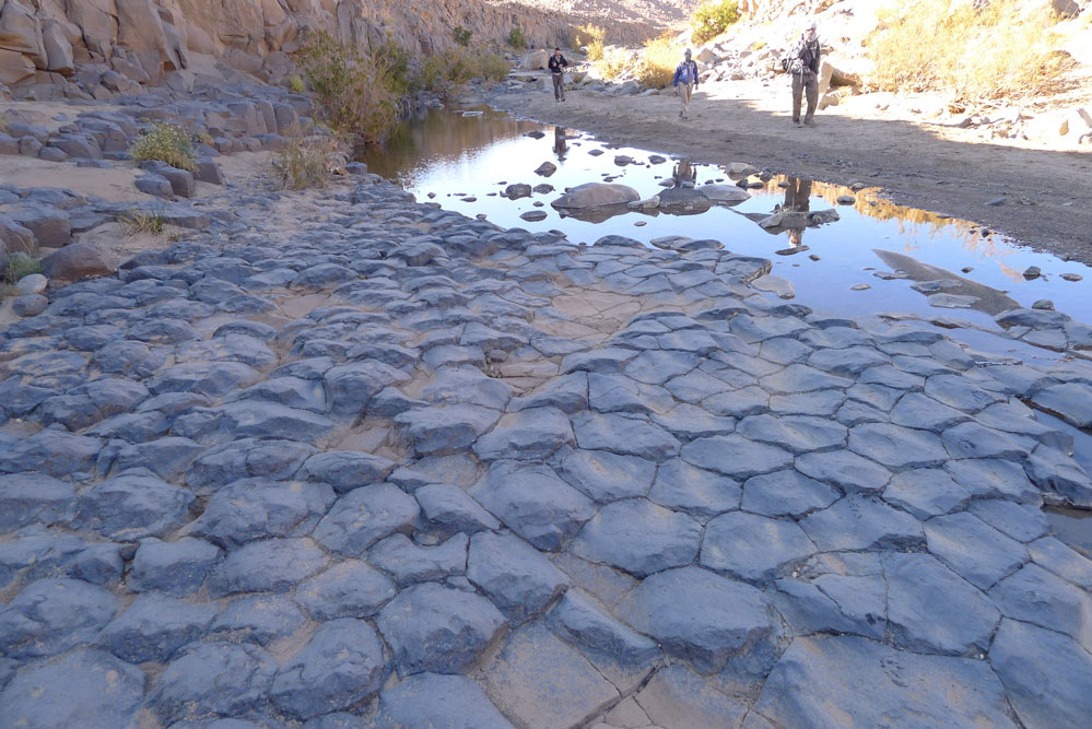 That afternoon was one of the best of the walk, not least because we put in a good 15 clicks after lunch. We followed the Afilal valley until it petered out and then crawled over low ridges into adjacent valleys and basins separated by more hills. Away from the grim basalt plateaux, we explored the granite ranges, passing a cobbled stone circle (left) just like the one we saw in Tadant oued, some 200km east of here at the tail end of SEQ in 2006. What they are exactly is still a mystery. A tomb is the most obvious answer, as these are the structures which most commonly survive, but most tombs have a focal point like a mound; this was just a very finely set flat ring of stones. It may just have been a pilot’s marker like this, but they are usually much bigger and out on the plain. Nearby, less well made examples had broken up over the years and in a nearby guelta, a flood-carved basalt pavement (below) added a natural wonder to the scene.