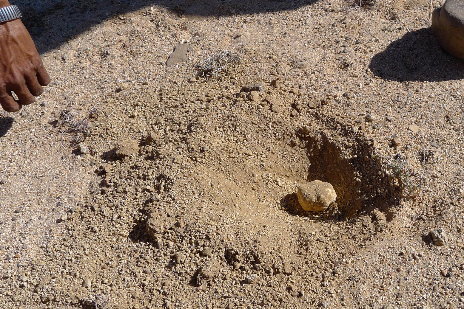 Cooler, less arid and twice the elevation of the Immidir, there were a lot more flowers (left) up here in the Hoggar, even though we were told it had not rained since the summer. I don’t know what any of them were but we were told it was the reason the hobbled camels set off up the rubble clad hillsides for a nibble every chance they got. At one point, after burning some plastic rubbish he came across, Honi stopped at a bulge of sand and carefully dug up a dense mushroom which I realise now was a truffle (left). Within a few minutes he had a few more and pointed to where rabbits had been digging others up. Just as he said that, a big rabbit or hare broke its cover and dashed off. I’ve never seen one before out here. Grilled on coals, the mushies made a delicious snack in the lunch oued an hour or two later.